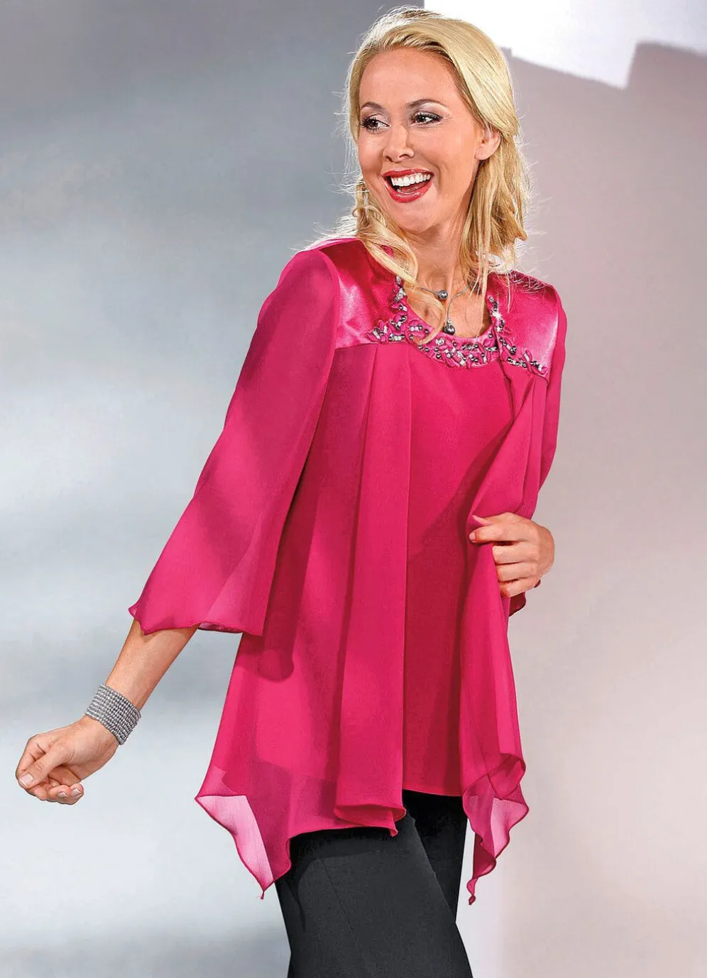 Mit viel Chic zeigt sich dieses 2-teilige Blusen-Set: verschlussloses Chasuble mit Schulterpolstern, glänzendem Satin-Besatz an der Schulterpartie mit funkelnden Strasssteinchen, Stickerei-Motiven, Schmucksteinen; Vorderteil und 3/4-lange Ärmel aus duftig transparentem Chiffon sowie zipfeliger Saumabschluss;