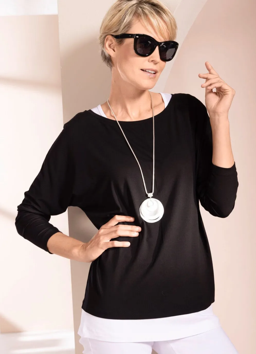 Extravagantes 2-teiliges Set, bestehend aus einem schwarzen Shirt mit langen Fledermausärmeln und Teilungsnaht im Rückteil.