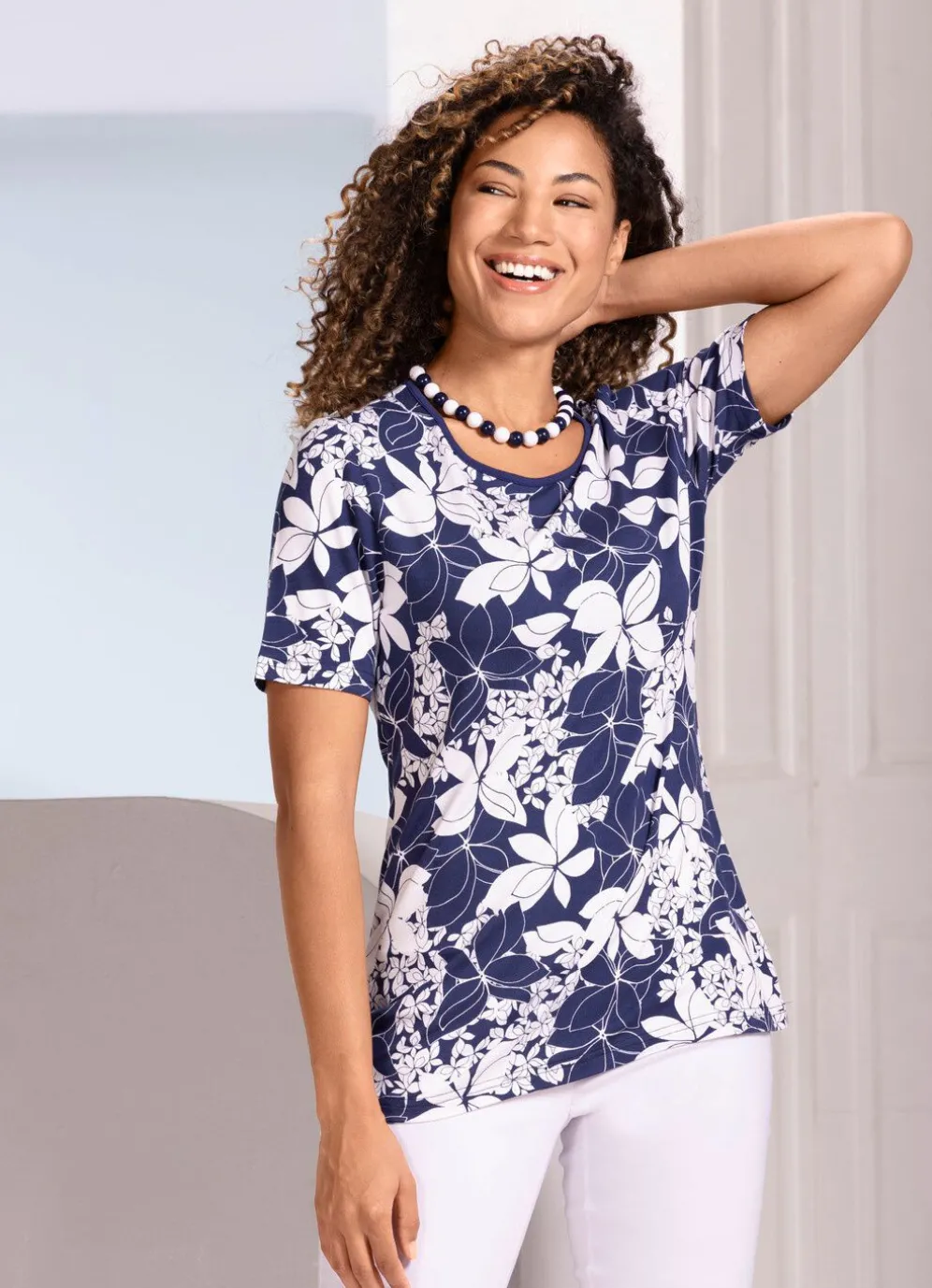 Ein absolutes Highlight ist dieses hübsche 2-teiliges Set: bestehend aus einer marinefarbenen Weste in legerer, verschlussloser Form sowie einem marine-weiß, allover dessinierten Shirt.