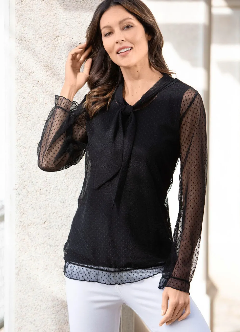 Super chic ist dieses 2-teilige Set; dezent transparentes Shirt mit abgerundetem V-Ausschnitt und Schluppe, lange Ärmel sowie Saumabschluss mit Gummizug und Käntelung,
