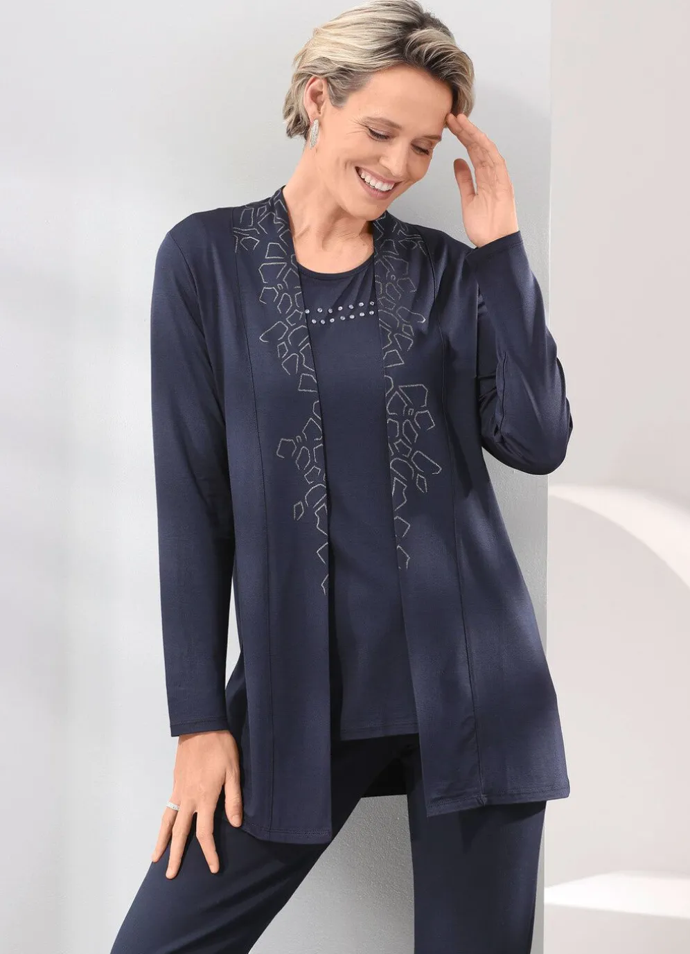 Schönes 2-teiliges Set, bestehend aus einer Shirtjacke in verschlussloser Form mit Glitzerdruck und einem Shirt mit Schmucksteinchen im Vorderteil und kurzen Ärmeln.