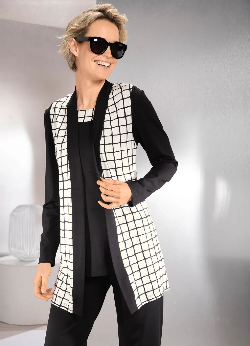 Jedes Teil ein Unikat! Ein absolutes Highlight ist dieses außergewöhnliche 2-teilige Set, bestehend aus einer schwarz-ecrufarbenen Weste in verschlussloser Form, sowie einem schwarzen Shirt mit Kontrastblende am Rundhals und mit langen Ärmeln.