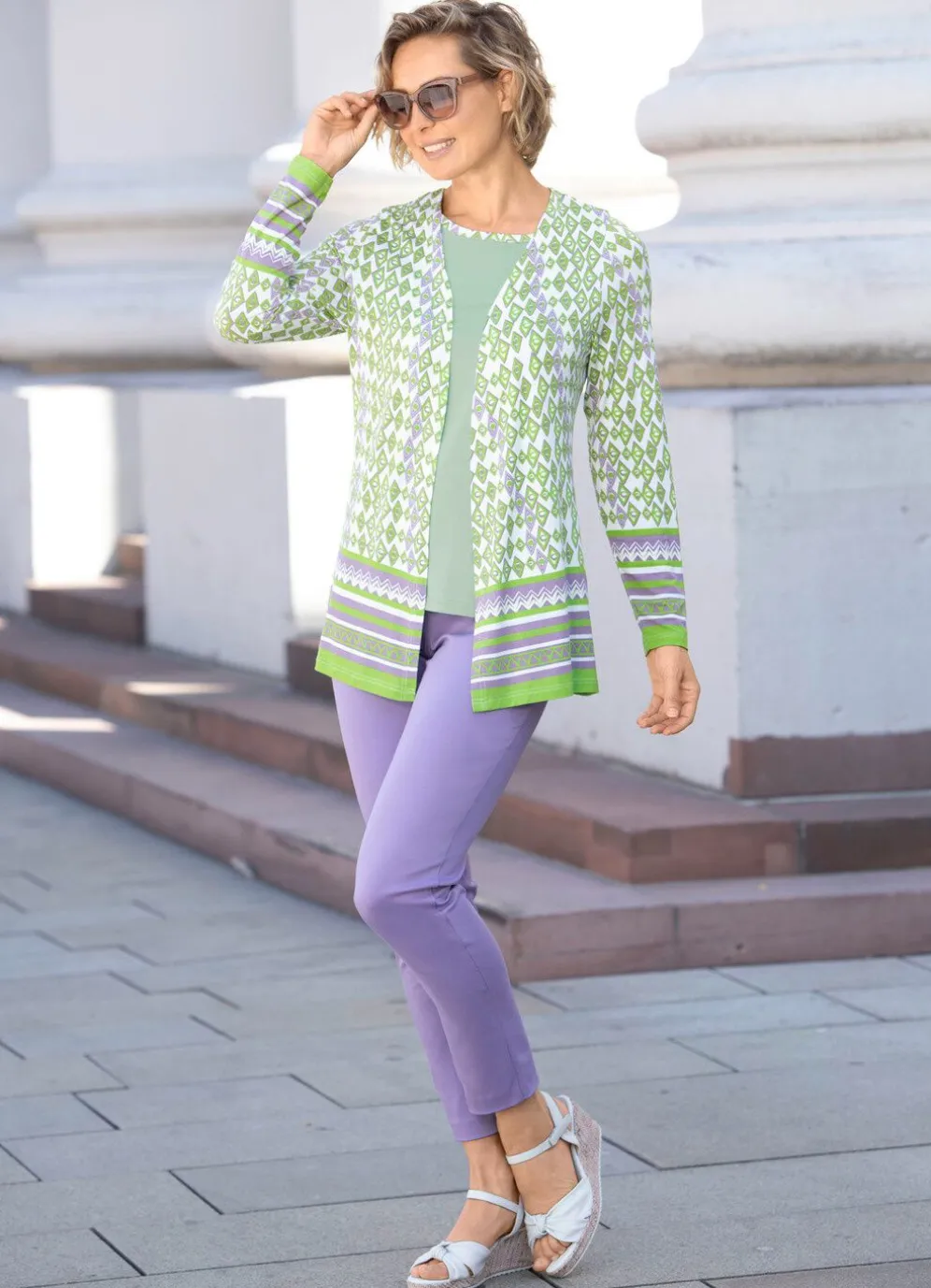Ein besonderer Blickfang ist dieses ansprechende 2-teilige Set bestehend aus einer Shirtjacke mit langen Ärmeln in legerer, verschlussloser Form in Grün-Weiß-Lila allover.