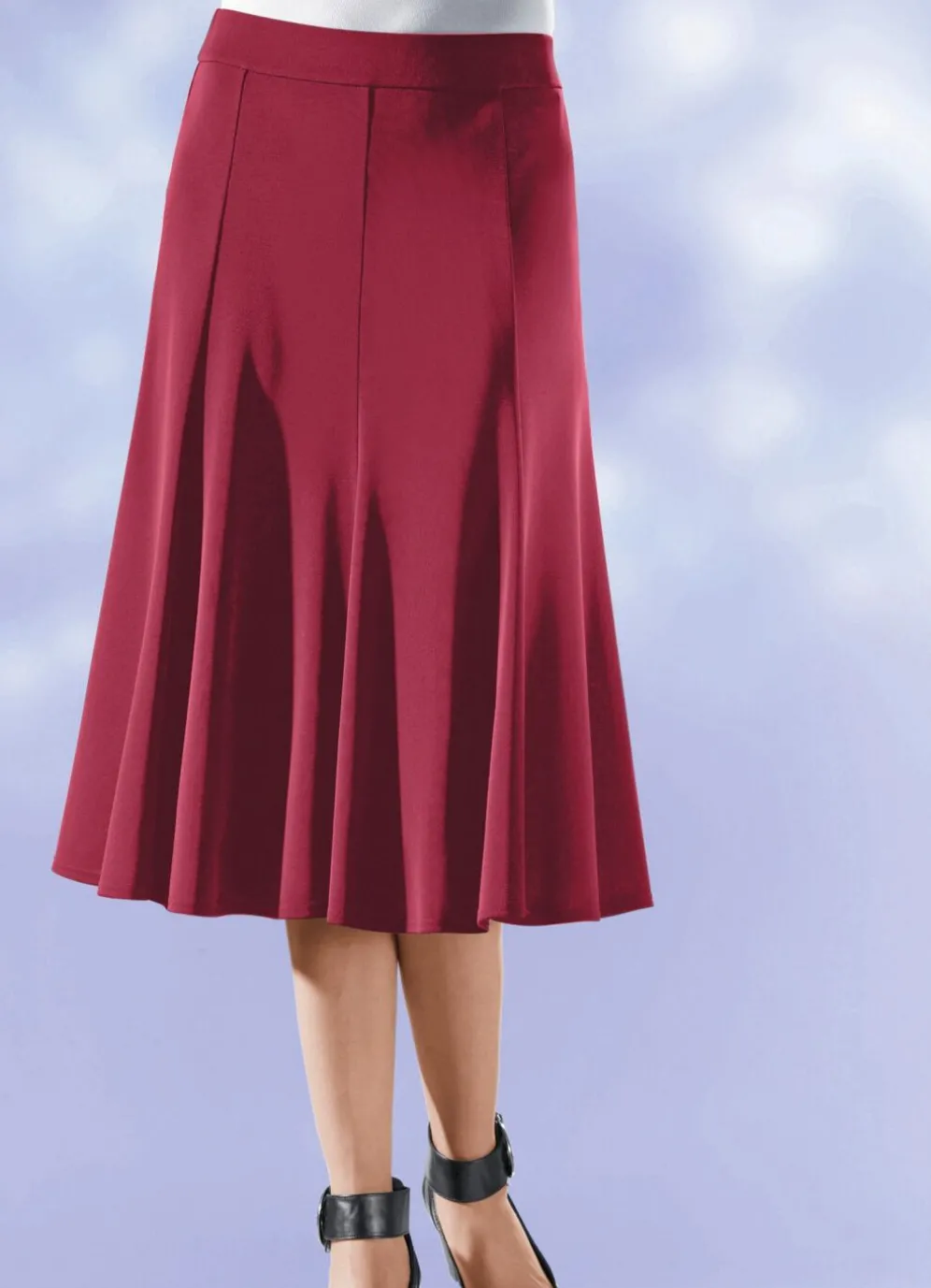 Exzellenter, weich fließender langer 8-Bahnenrock in komfortabler Schlupfform, glatt anliegend dank des innenliegenden, unsichtbaren Rundum-Dehnbundes, mit glockig schwingendem Saumabschluss. Länge ab Taille ca. 72 cm, bei K-Gr. ca. 68 cm.