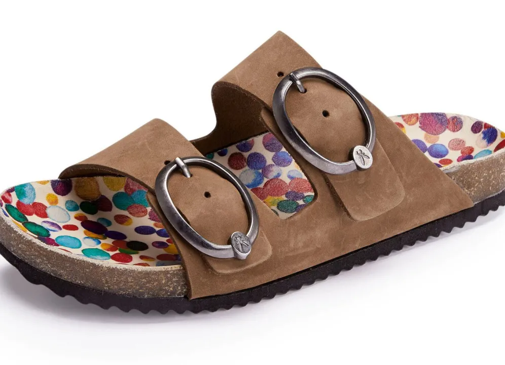 Angesagte Pantolette aus weichem Nubukleder, mit zwei verstellbaren Schnallen: bunt bedrucktes Lederfußbett, leichte EVA-Profilsohle sowie 10 mm Keilabsatz