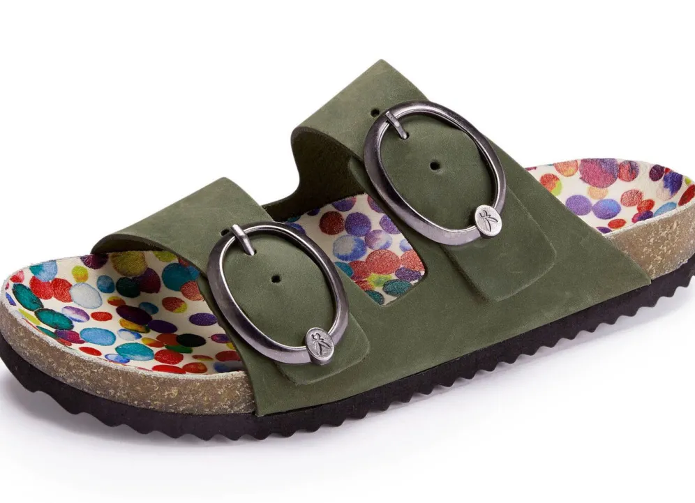 Angesagte Pantolette aus weichem Nubukleder, mit zwei verstellbaren Schnallen: bunt bedrucktes Lederfußbett, leichte EVA-Profilsohle sowie 10 mm Keilabsatz