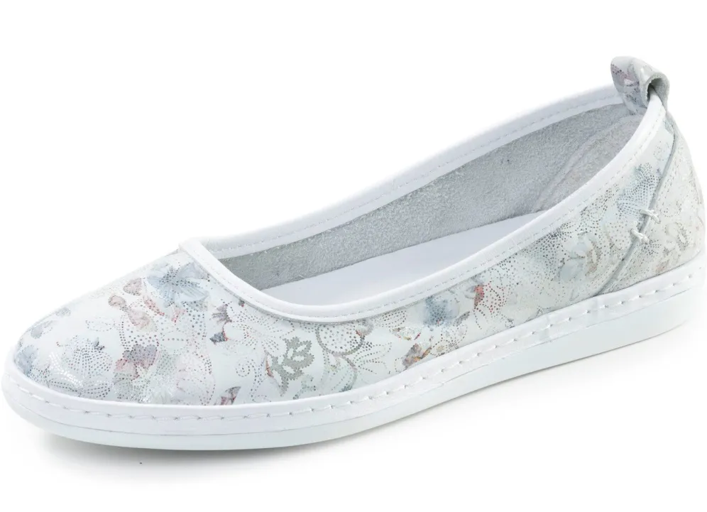 Ballerinas in Ecru-Bunt aus weichem, floral bedrucktem Nubukleder: Weite G, herausnehmbares Lederfußbett, leichte TPR-Riffelsohle sowie 10 mm Keilabsatz