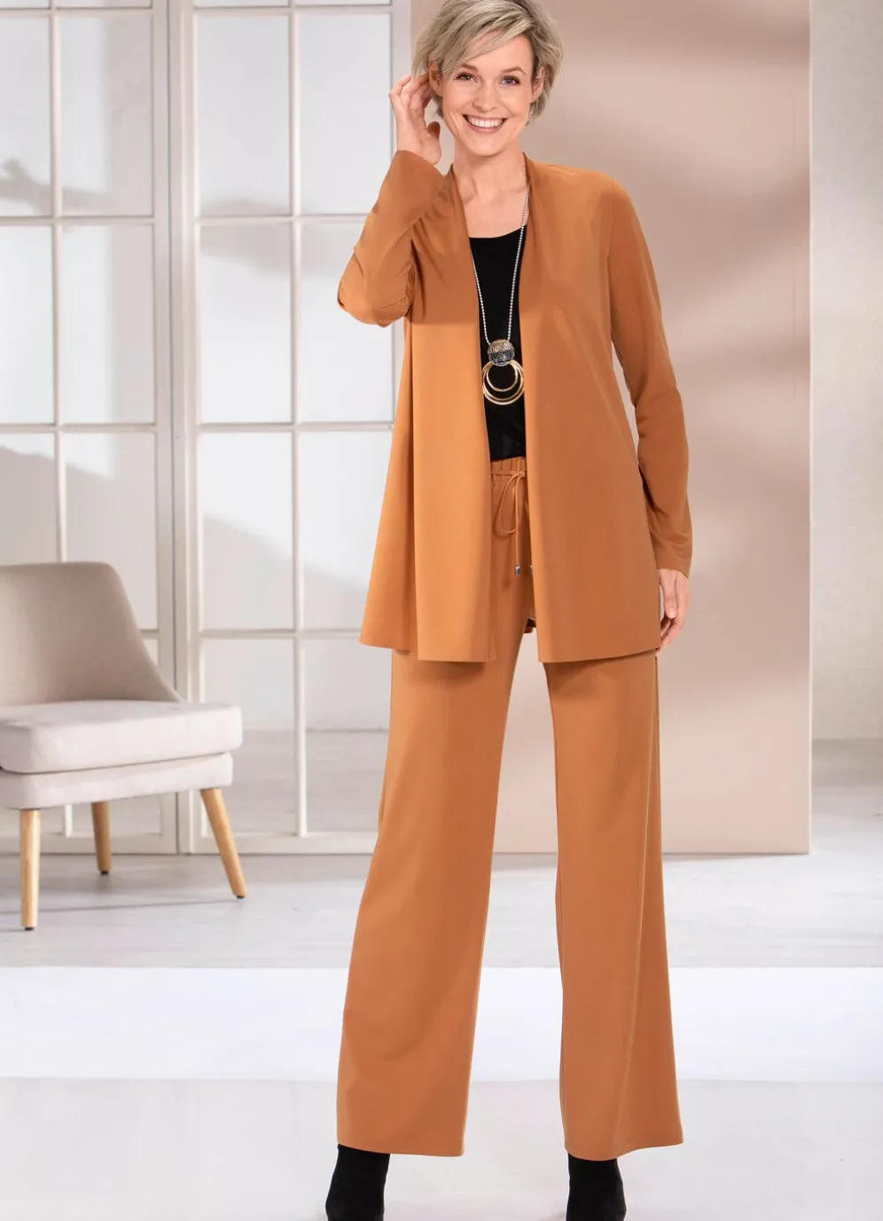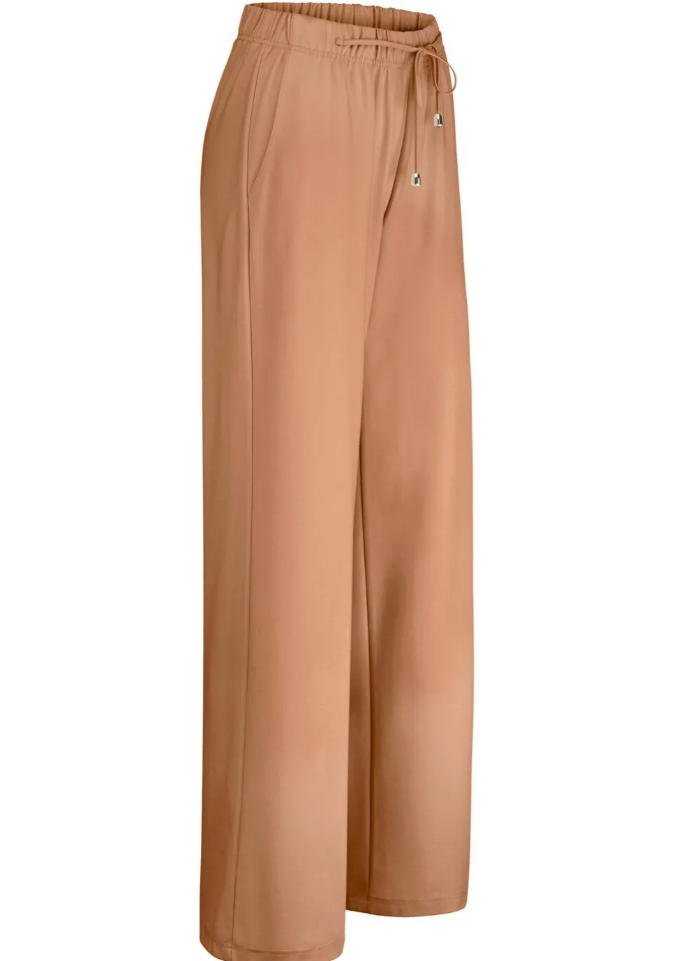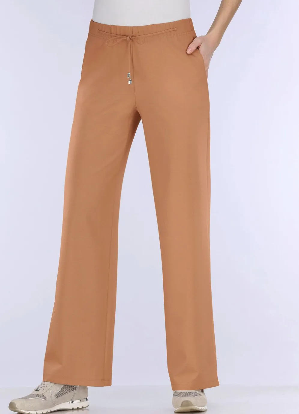 Angesagte Hose in modischer Weite und bequemer Schlupfform, mit Dehnbund rundum sowie Zierbindeband vorne am Bund und Seitentaschen. Innenbeinlänge ca. 78 cm, Fußweite ab 54 cm.