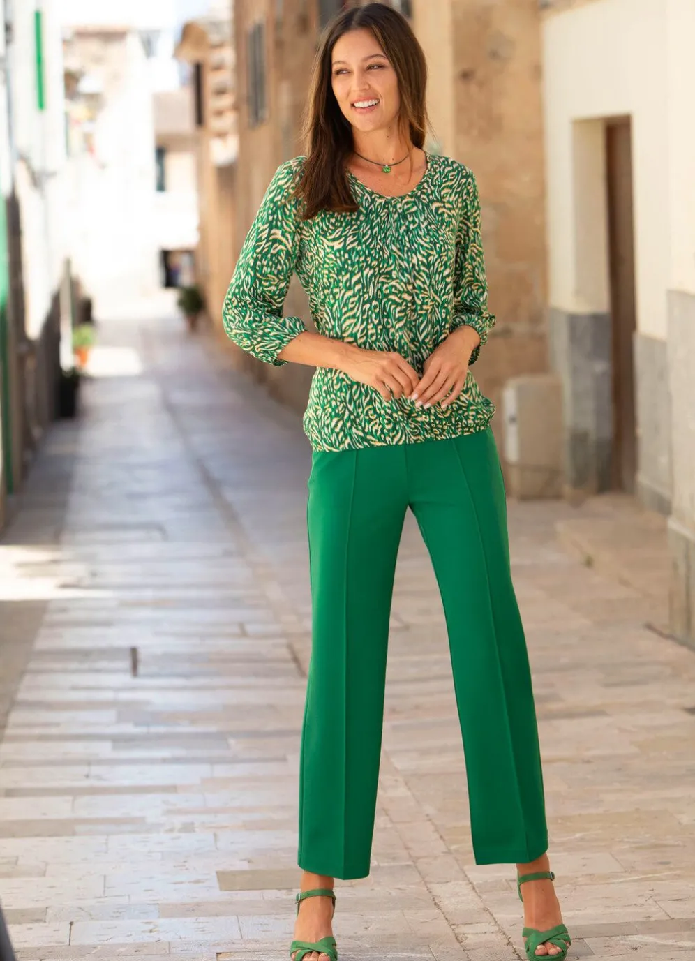 Mit farbbrillantem Druck ausgestattet ist diese faszinierende Tunika in Grün-Sand-Ocker-Bunt, mit hübscher Fältelung am Rundhalsausschnitt, elastischen Abschlüssen an den 3/4-langen Ärmeln sowie am Saum rundum.
