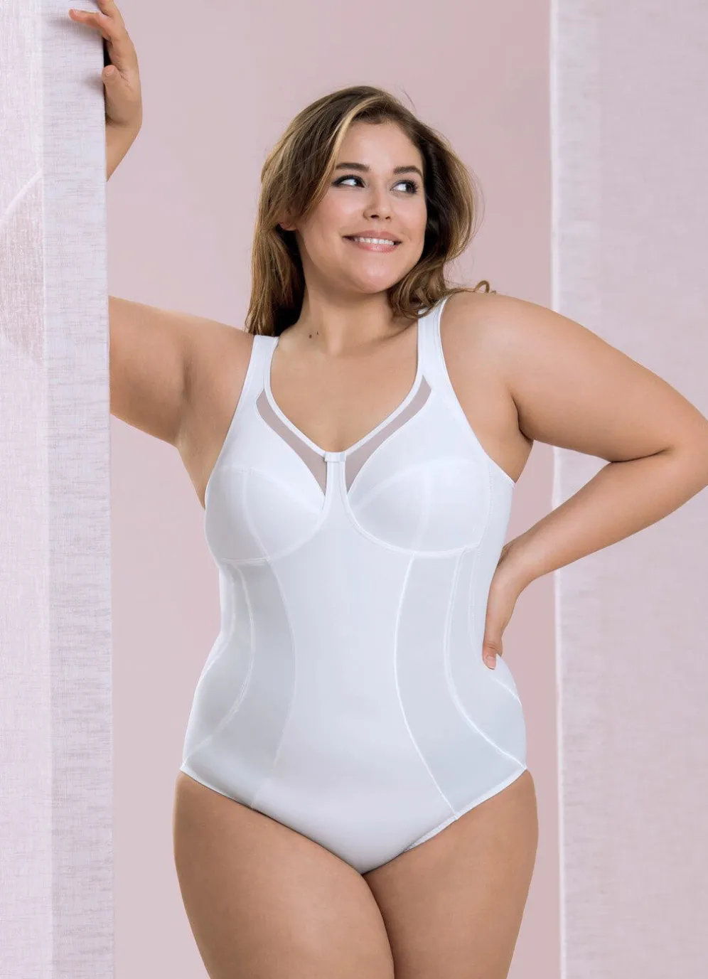 Hosenkorselett von „Anita“, mit seitlicher, stützender Blende in den Cups, transparenten Tülleinsätzen am Dekolleté, Verstärkung in der Bauchpartie, breiten, im Schulterbereich gepolsterten, verstellbaren Stretchträgern sowie Hakenverschluss und Baumwolleinlage im Schritt.