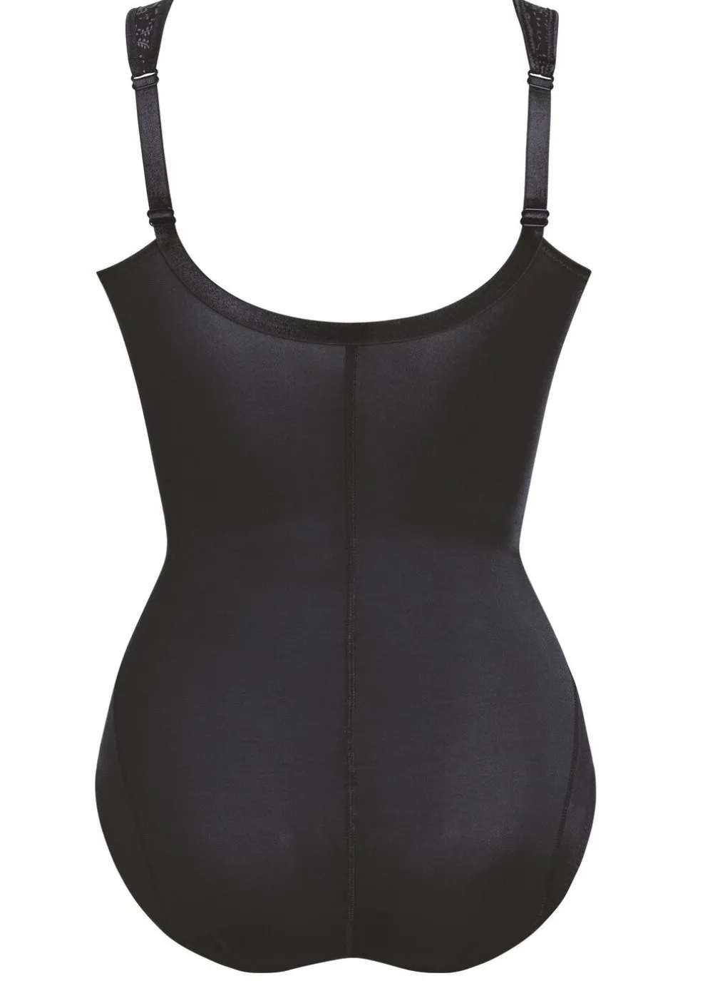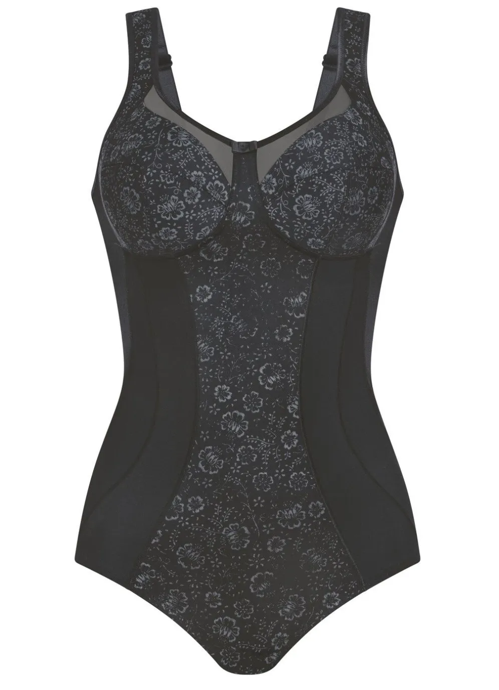 „Anita“-Hosenkorselett mit farbharmonischem Floraldessin im Vorderteil, transparenten Tülleinsätzen am Dekolleté, seitlicher, stützender Blende in den Cups, verstärkter Bauchpartie, schlankmachenden Teilungsnähten, im Schulterbereich unterlegten, verstellbaren Stretchträgern sowie Hakenverschluss und Baumwolleinlage im Schritt.