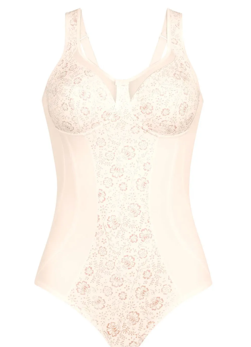 „Anita“-Hosenkorselett mit farbharmonischem Floraldessin im Vorderteil, transparenten Tülleinsätzen am Dekolleté, seitlicher, stützender Blende in den Cups, verstärkter Bauchpartie, schlankmachenden Teilungsnähten, im Schulterbereich unterlegten, verstellbaren Stretchträgern sowie Hakenverschluss und Baumwolleinlage im Schritt.