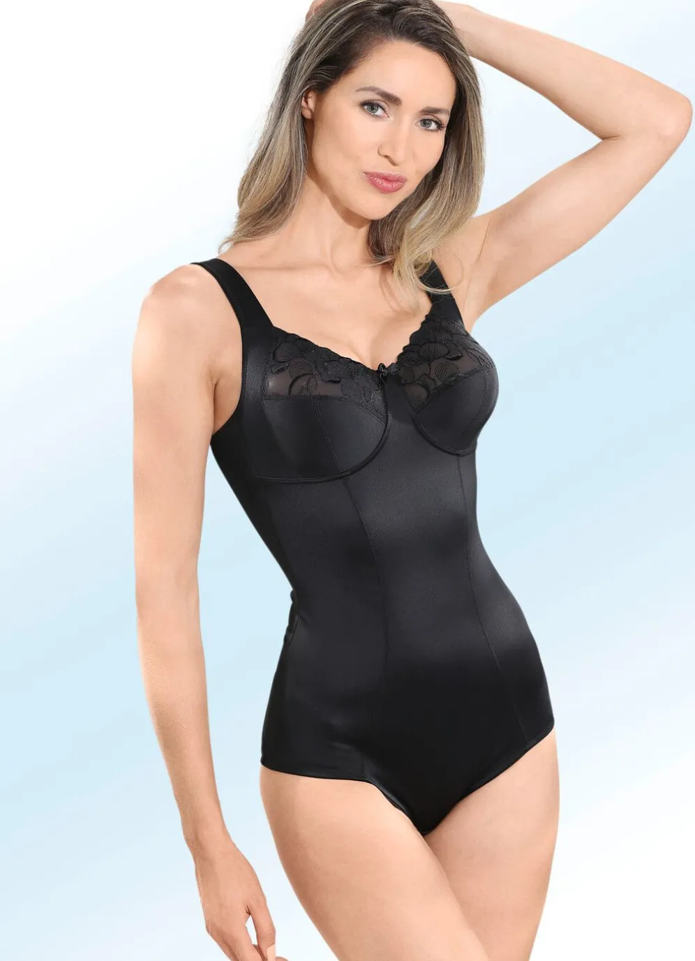 „Anita“-Hosenkorselett: elastische Tüllstickereispitze am Dekolleté, Verstärkung im Vorderteil, weich gepolsterte, verstellbare Stretchträger, Hakenverschluss und Baumwolleinlage im Schritt.