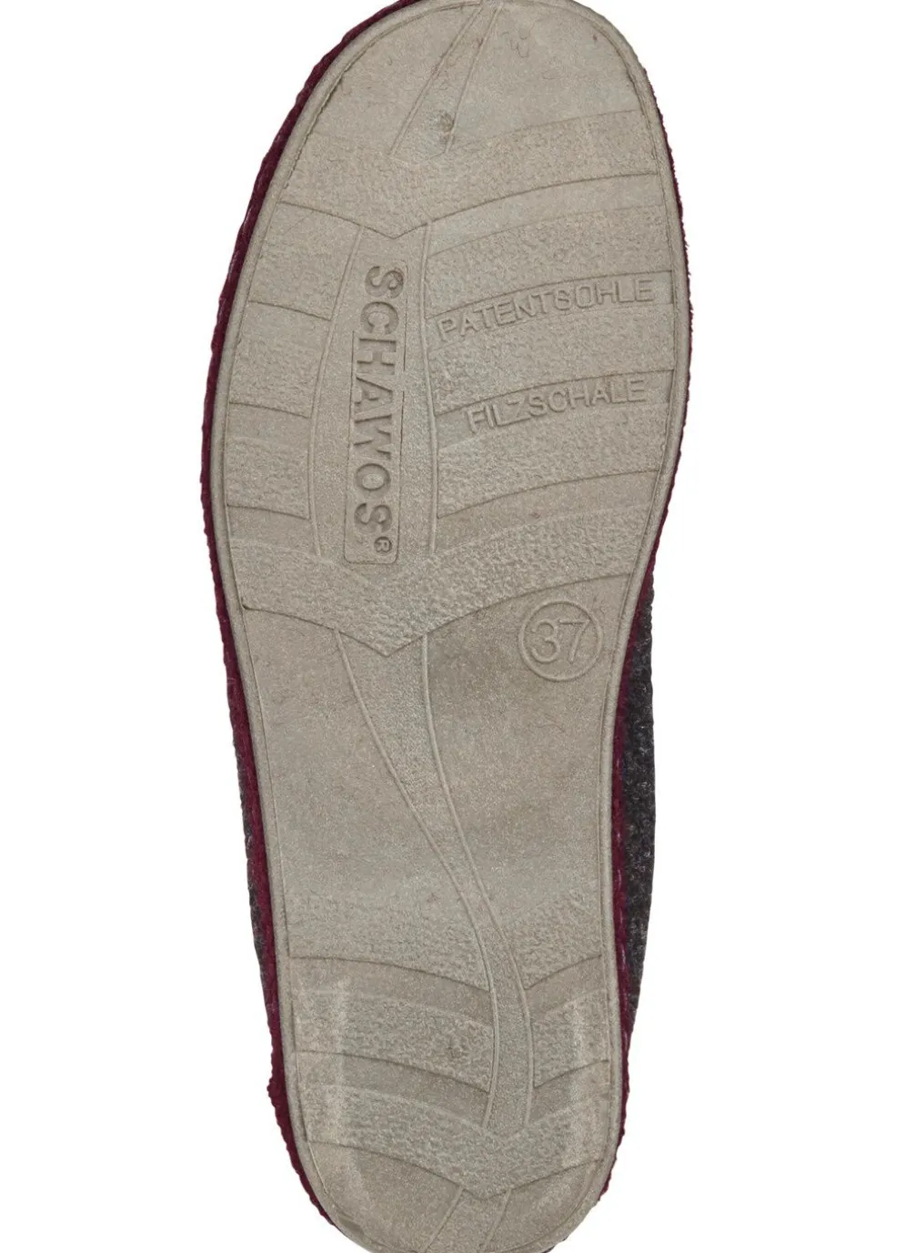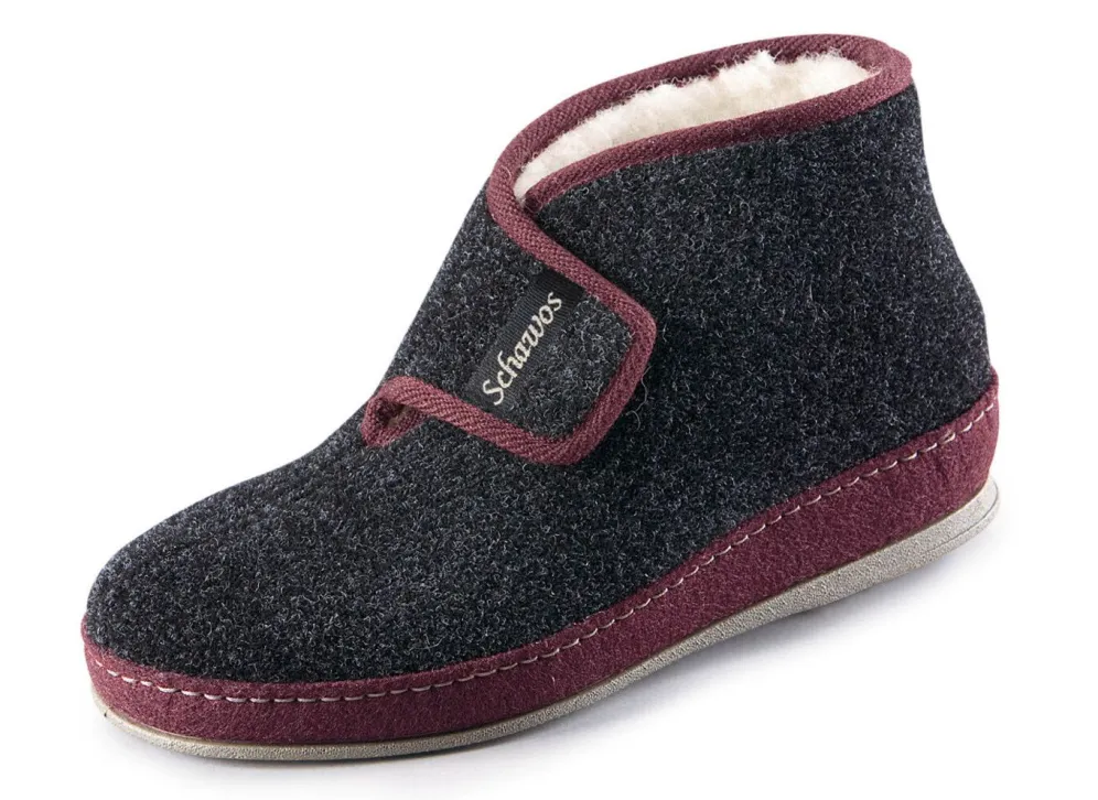 Hausschuhe aus atmungsaktivem Textilmaterial: Klettverschluss, Warmfutter und Fußbettbezug aus 100% Schurwolle, Fersenluftpolster, Filzschalensohle, TR-Laufsohle sowie 25 mm Keilabsatz