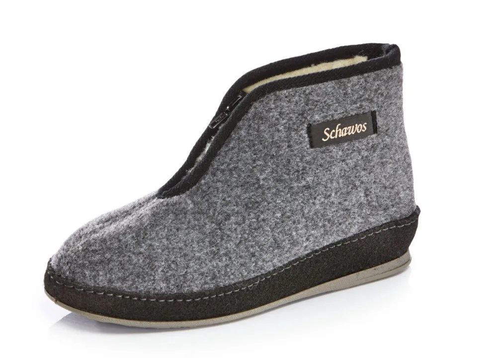 Atmungsaktive Hausschuhe aus Textil mit Reißverschluss: Warmfutter und Fußbettbezug aus 100% Schurwolle, Fersenluftpolster, Filzschalensohle, TR-Laufsohle sowie 25 mm Keilabsatz