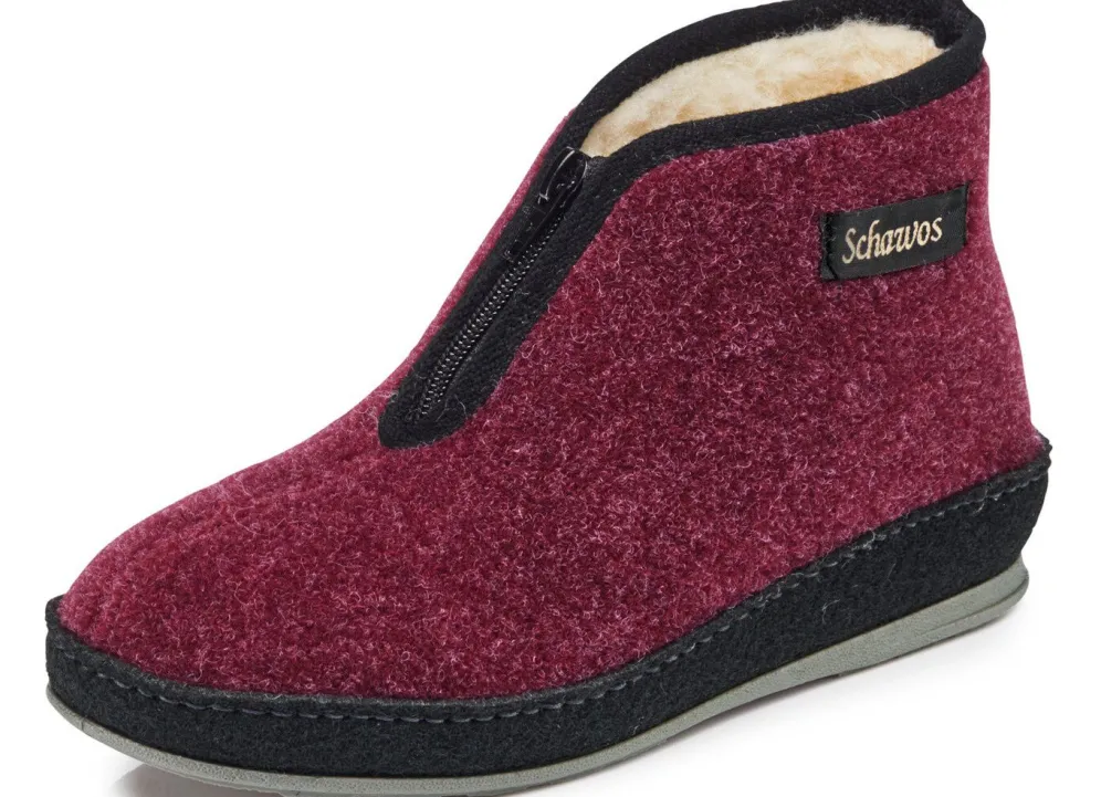 Atmungsaktive Hausschuhe aus Textil mit Reißverschluss: Warmfutter und Fußbettbezug aus 100% Schurwolle, Fersenluftpolster, Filzschalensohle, TR-Laufsohle sowie 25 mm Keilabsatz