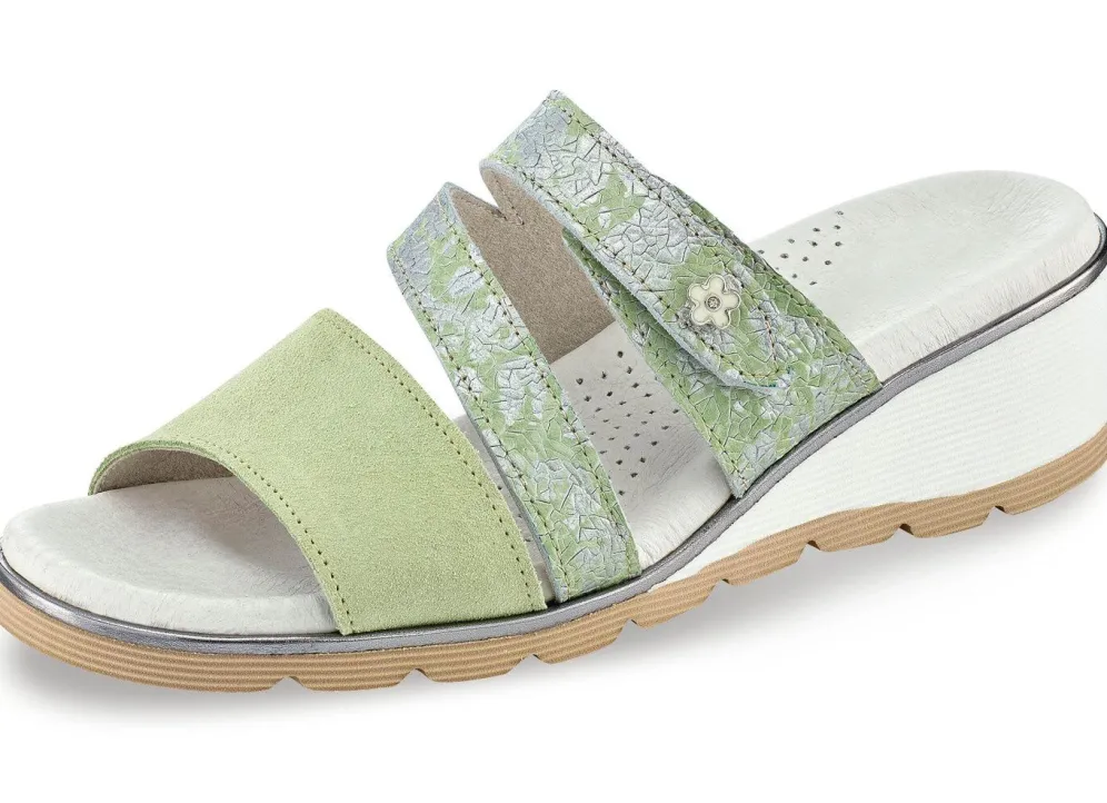 Pantoletten aus Rind-Veloursleder in Mint, mit metallisiert geprägten Einsätzen: Weite G, verstellbare Klettspange, atmungsaktives Futter, Wörishofer Lederfußbett mit Zehengreifer und Pelotte, super leichte, flexible Microzell-Profilsohle, 40 mm Keilabsatz mit altsilberfarbener Einlage