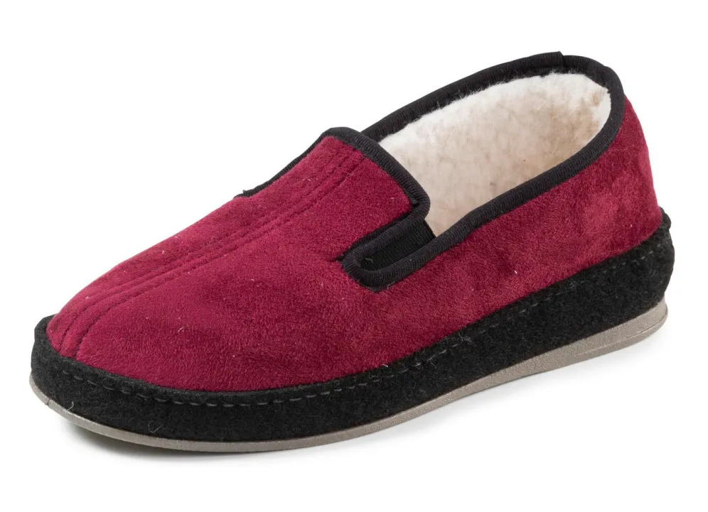 Atmungsaktiver Velours-Hausschuh in Bordeaux-Schwarz, mit seitlichen Gummizügen: Warmfutter und Fußbettbezug aus 100% Schurwolle, Fersenluftpolster, Filzschalensohle, TR-Laufsohle sowie 25 mm Keilabsatz