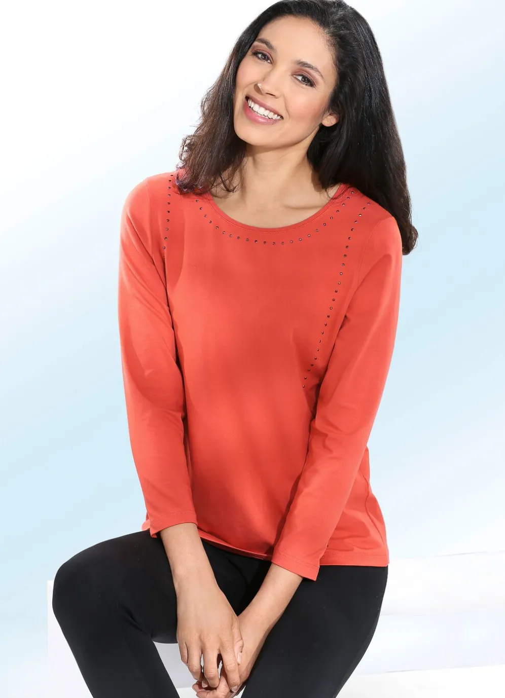 Lassen Sie sich von diesem attraktiven Shirt mit Plättchenzier im Vorderteil sowie 3/4-langen Ärmeln überzeugen!