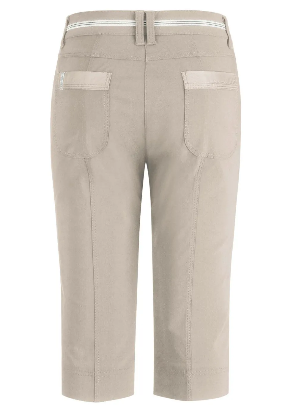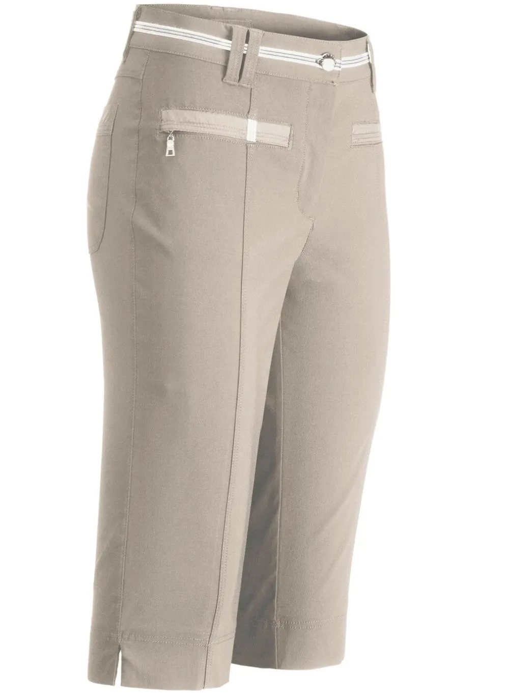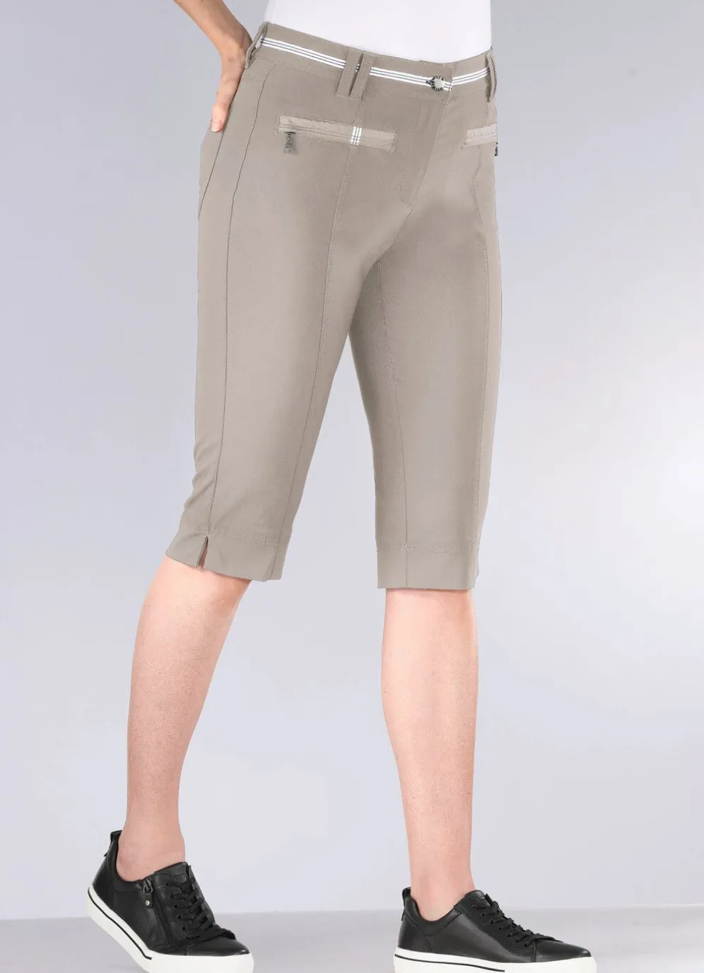 Unsere aufwendig gearbeitete Bermudas für die Freizeit: elastischer Bund mit kontrastfarbenem Zierband, Knopf- und Reißverschluss, paspelierte Seitentaschen mit Reißverschluss, Gesäßtaschen, Passe im Rückteil sowie figurgünstige, abgesteppte Teilungsnähte im Vorder- und Rückteil. Innenbeinlänge ca. 41 cm