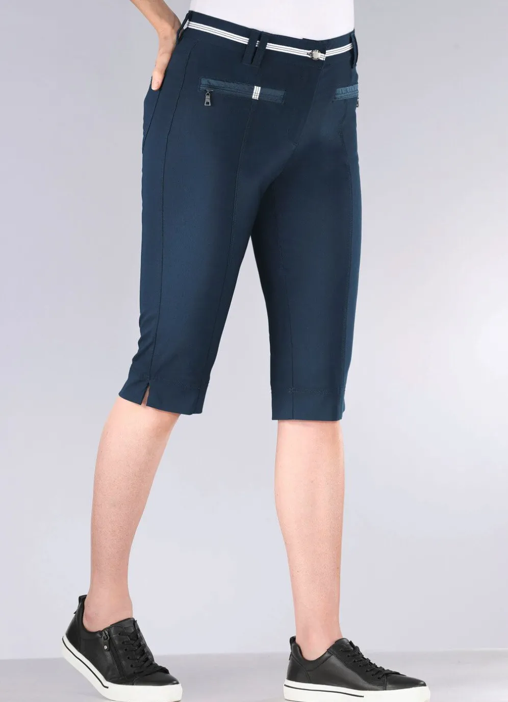 Unsere aufwendig gearbeitete Bermudas für die Freizeit: elastischer Bund mit kontrastfarbenem Zierband, Knopf- und Reißverschluss, paspelierte Seitentaschen mit Reißverschluss, Gesäßtaschen, Passe im Rückteil sowie figurgünstige, abgesteppte Teilungsnähte im Vorder- und Rückteil. Innenbeinlänge ca. 41 cm