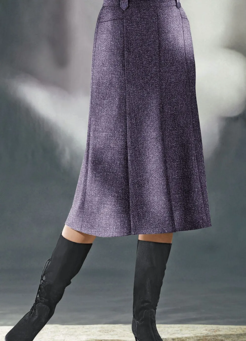 Attraktiver, tragangenehmer und knitterfreier, nach unten hin leicht ausgestellter langer 8-Bahnenrock mit rückwärtigen Dehnbundeinsätzen, zwei Zierschlaufen mit schmückenden Zierknöpfen vorne am Bund, Seitentaschen sowie hinterem Nahtreißverschluss. Länge ab Taille ca. 72 cm, bei K-Gr. ca. 68 cm.