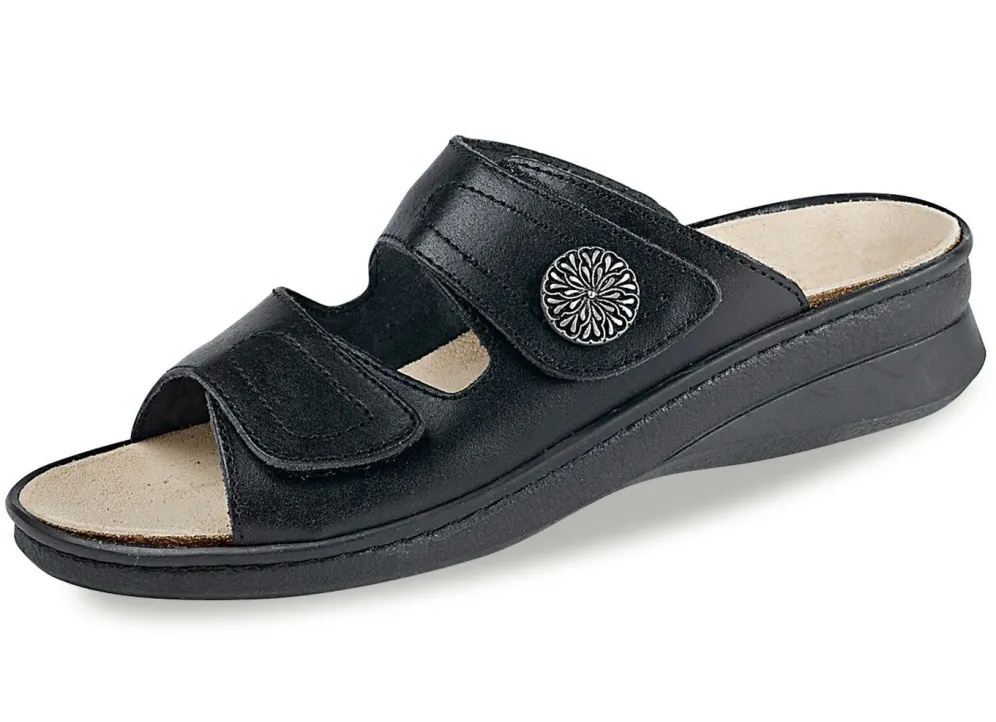 Pantoletten aus Rind-Nappaleder: zwei verstellbare Klettspangen, herausnehmbares Kork-Naturkautschuk-Lederfußbett, leichte TR-Riffelsohle sowie 35 mm Keilabsatz