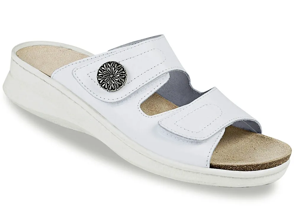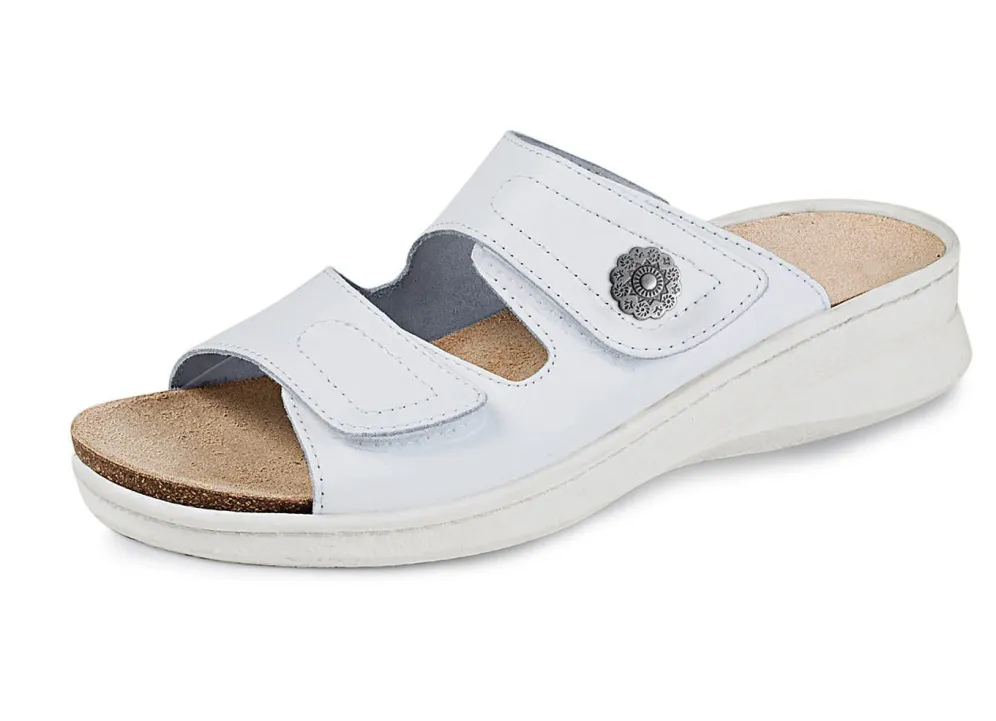 Pantoletten aus Rind-Nappaleder: zwei verstellbare Klettspangen, herausnehmbares Kork-Naturkautschuk-Lederfußbett, leichte TR-Riffelsohle sowie 35 mm Keilabsatz