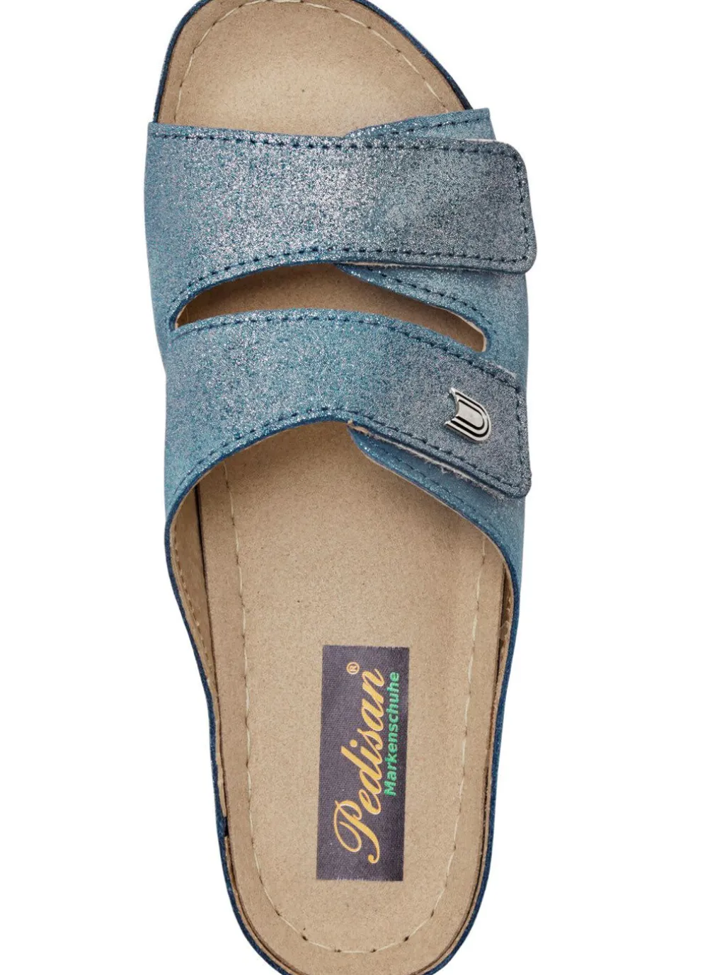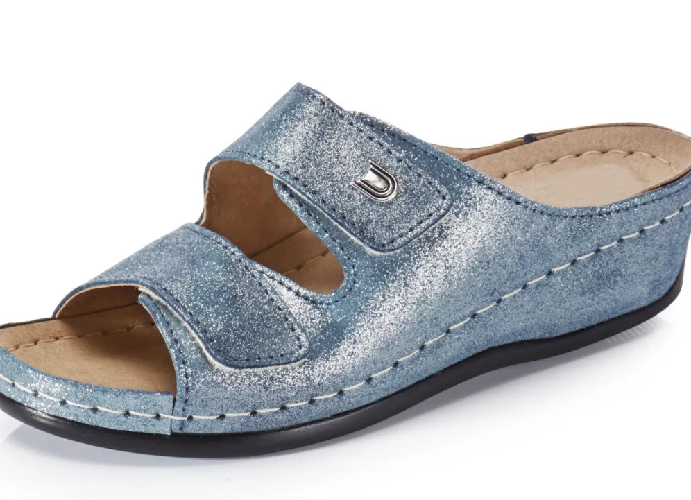 Pantoletten aus Rind-Veloursleder mit silberfarbener Glitzer-Prägung: Weite G, zwei verstellbare Klettspangen, Lederfutter, gepolstertes Lederfußbett, leichte PU-Laufsohle, 40 mm Keilabsatz