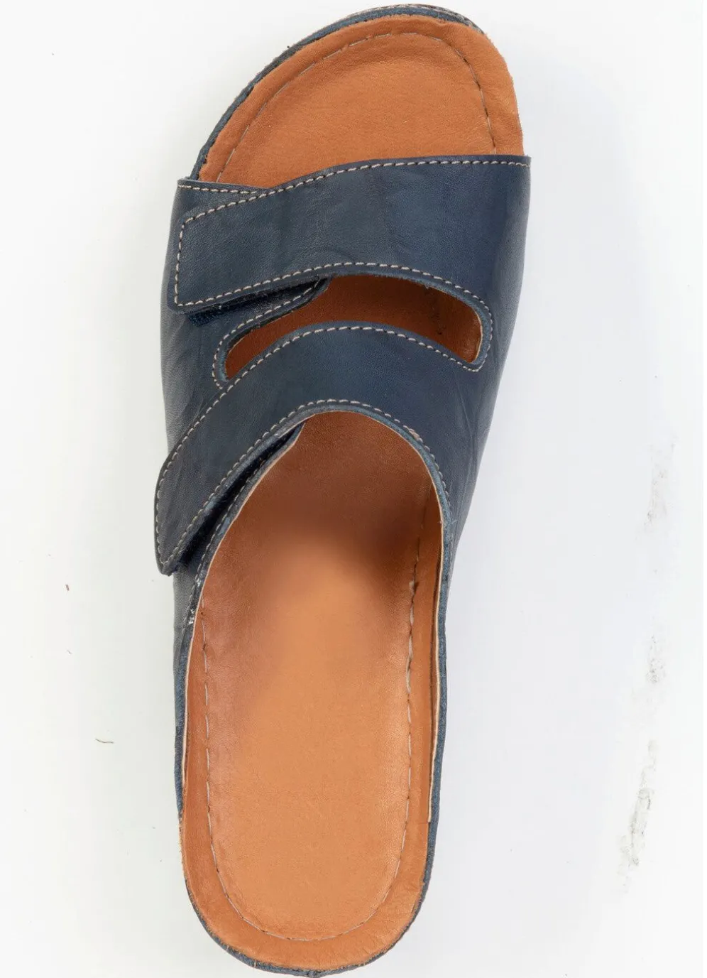 Pantoletten aus Nappaleder mit dezent schattierter Knitter-Struktur: Weite G, zwei verstellbare Klettspangen, Futter, gepolstertes Lederfußbett, leichte PU-Laufsohle sowie 30 mm Keilabsatz