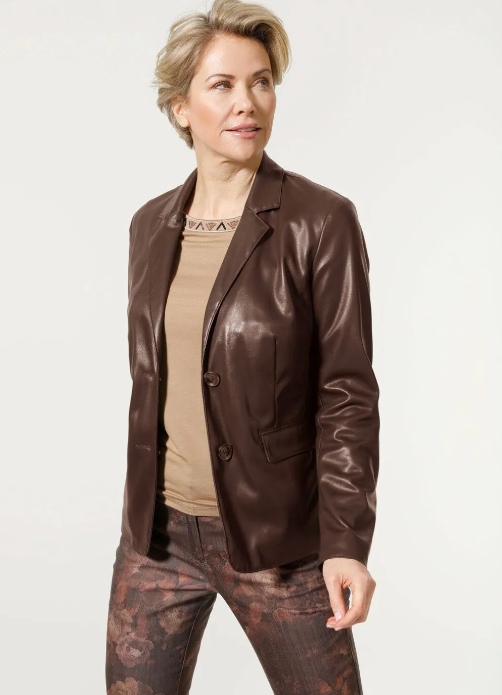 Leicht taillierter Blazer mit Reverskragen, Knopfleiste, Pattentaschen, Zierknöpfen an den Ärmelabschlüssen sowie einer Innentasche. Länge ca. 65 cm.