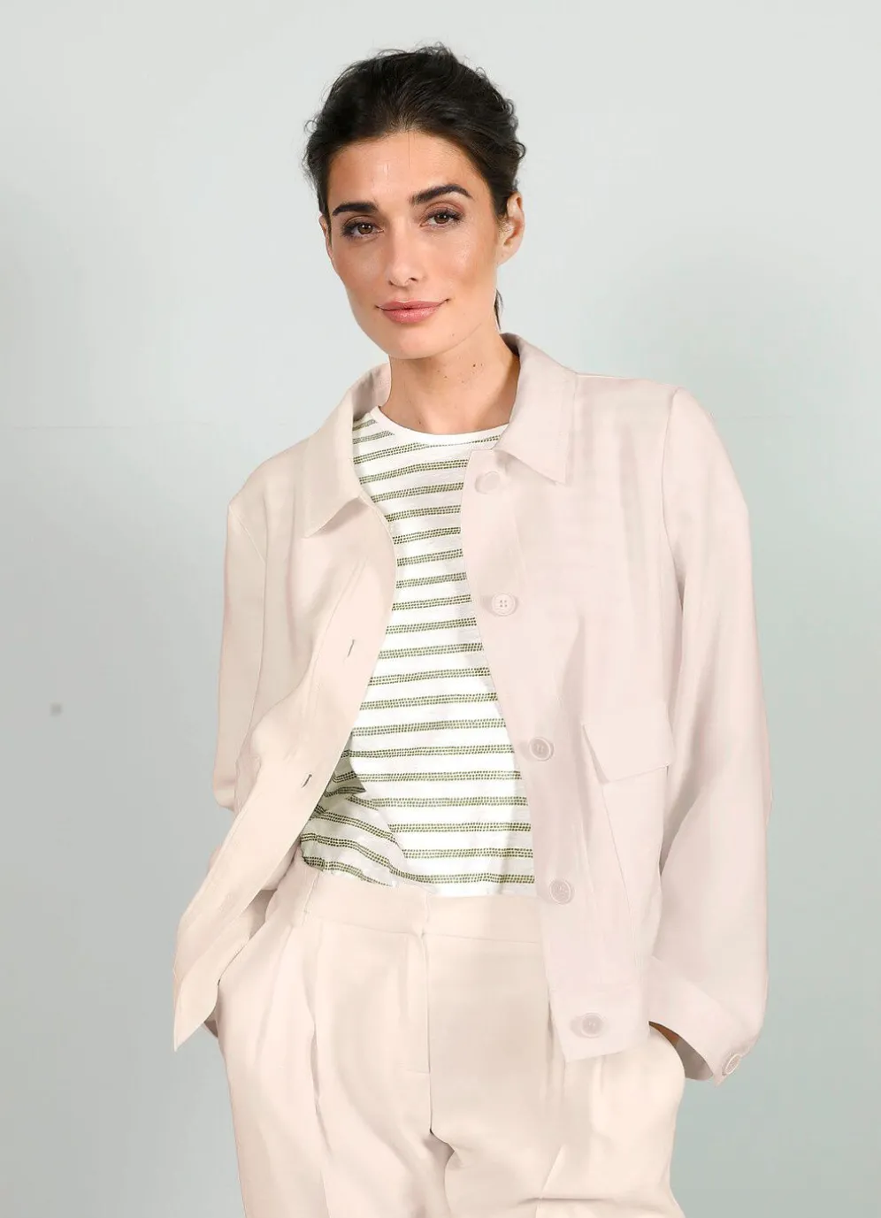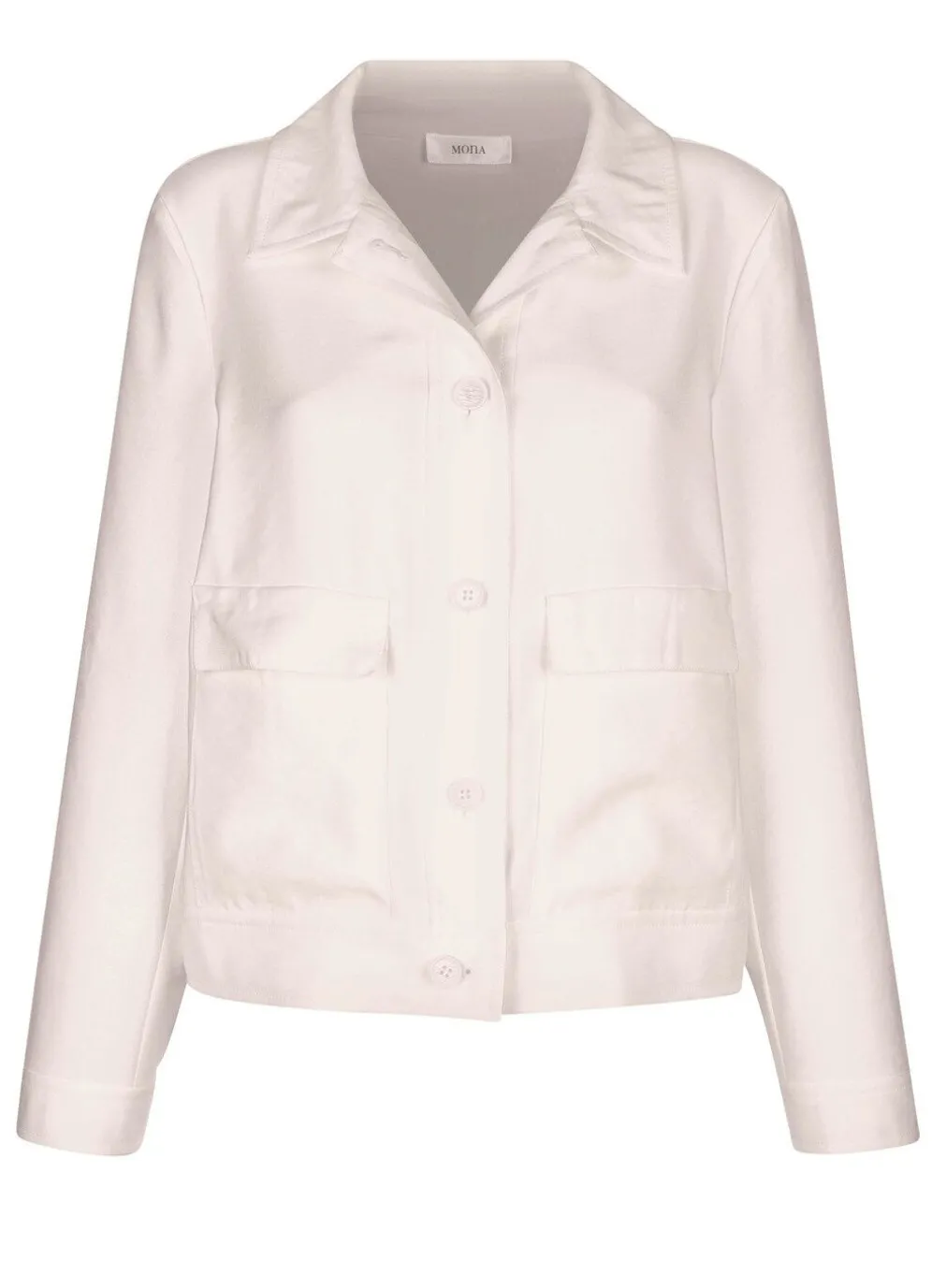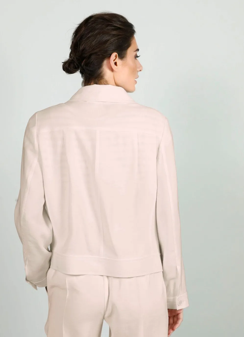 Gerade geschnittener Blazer mit Hemdkragen, Pattentaschen sowie langen Ärmeln mit Knopf und Manschette. Länge ca. 55 cm.
