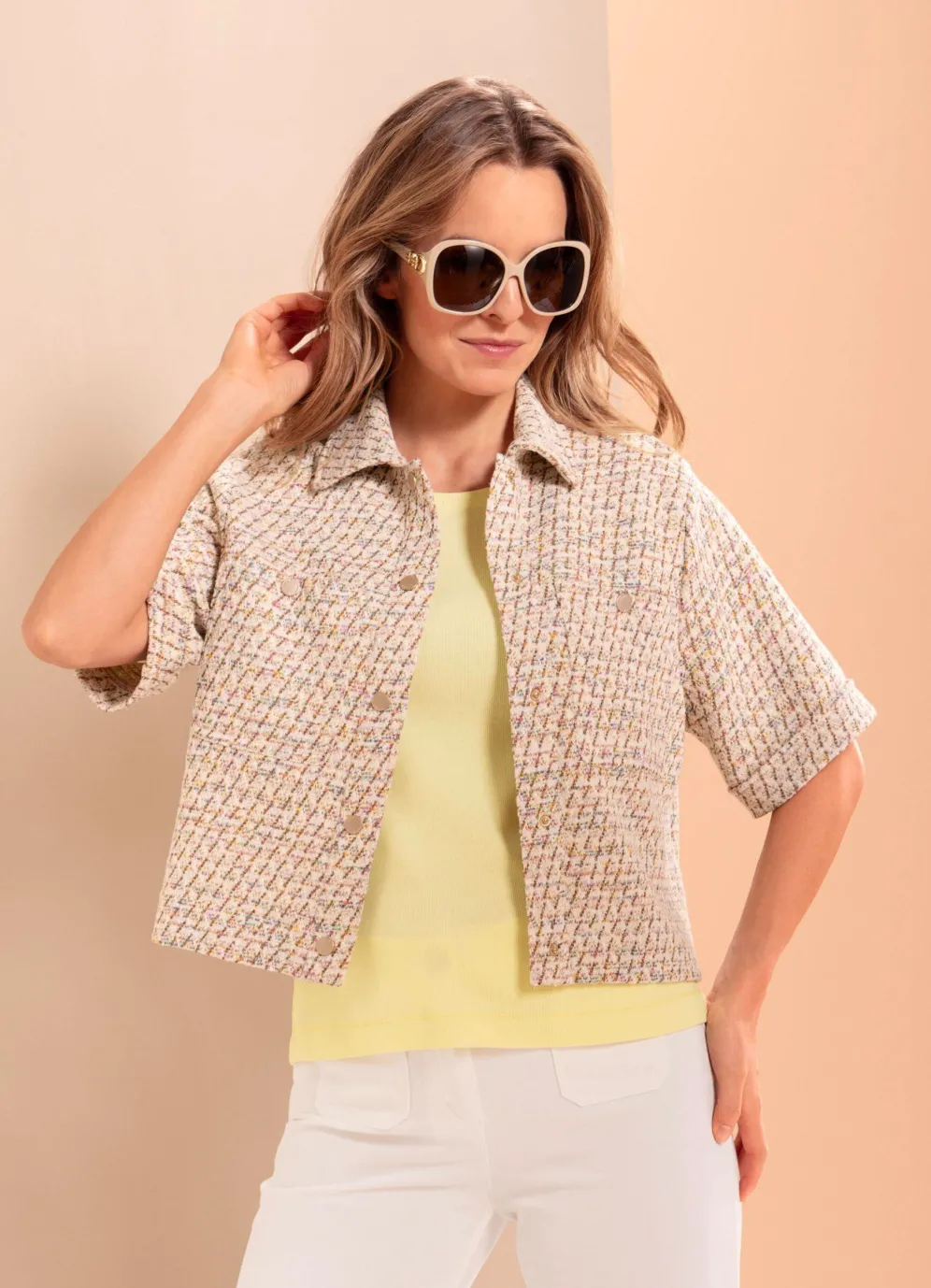 Strickjacke von B/ANCA in Beige-Bunt, mit dezenten Glitzereffekten allover: auf fünf Druckknöpfe zu schließen, kurze Ärmel mit Umschlag sowie zwei aufgesetzte Brusttaschen.