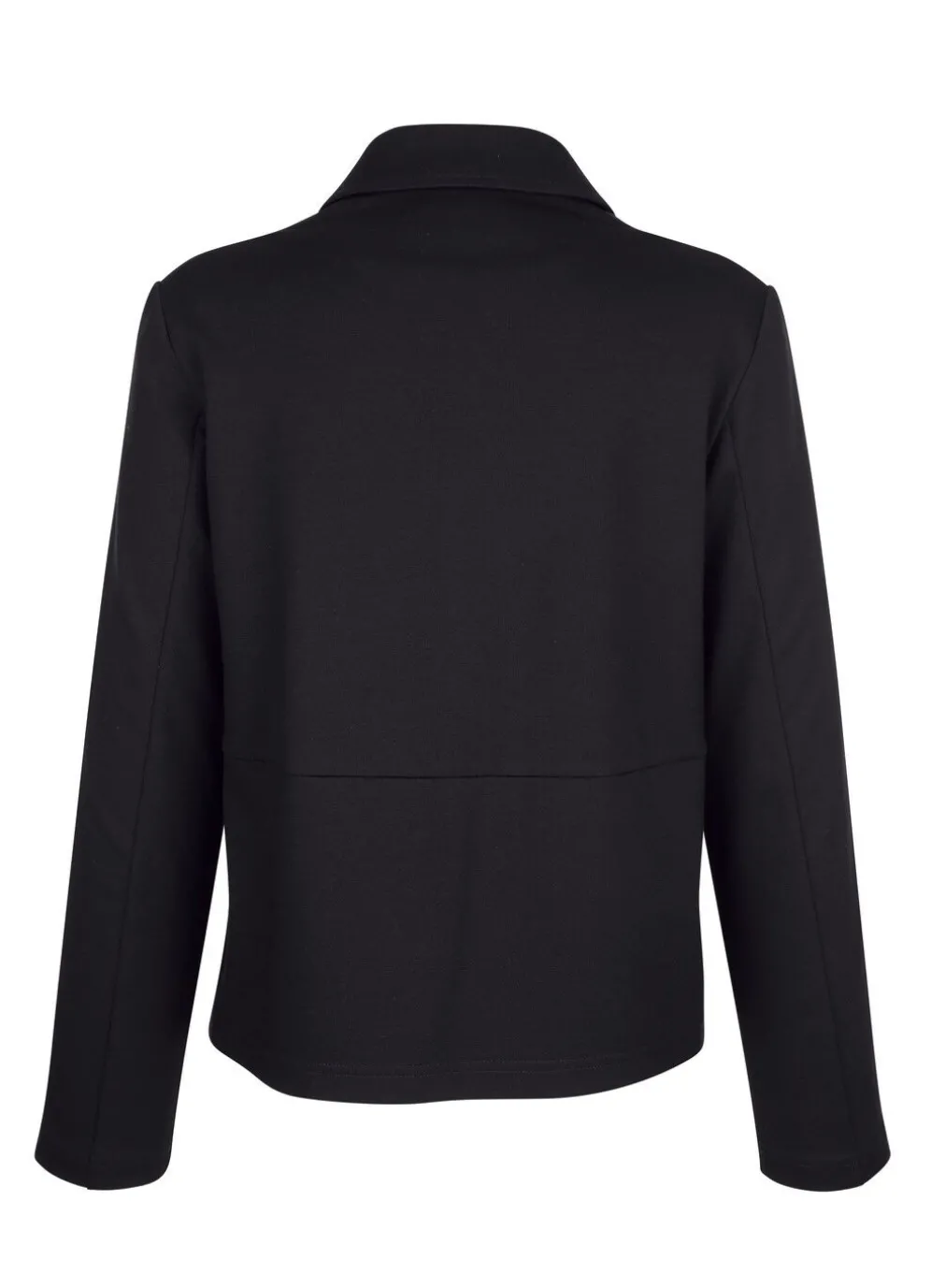 Blazer mit Hemdkragen, Knopfleiste, Nappaleder-Imitatbesätzen auf den Ärmeln sowie aufgesetzten Taschen. Länge ca. 59 cm.