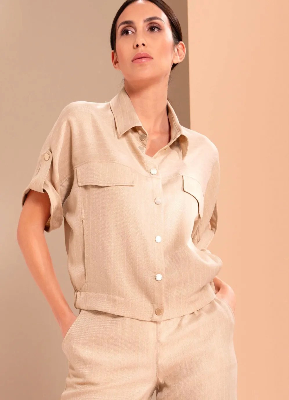 Der Blazer von B/ANCA in Taupe verfügt über einen Hemdkragen, Umschlag an den kurzen Ärmeln mit Riegel und Druckleiste, Seitentaschen sowie seitliche Gummizüge im Saum.