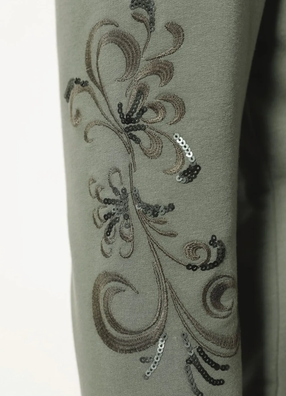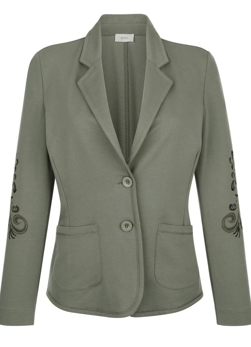 Ein echtes Highlight ist dieser leicht taillierte Blazer mit hübscher Stickerei auf den Ärmeln, Reverskragen, Knopfleiste sowie aufgesetzte Taschen. Länge ca. 59 cm.