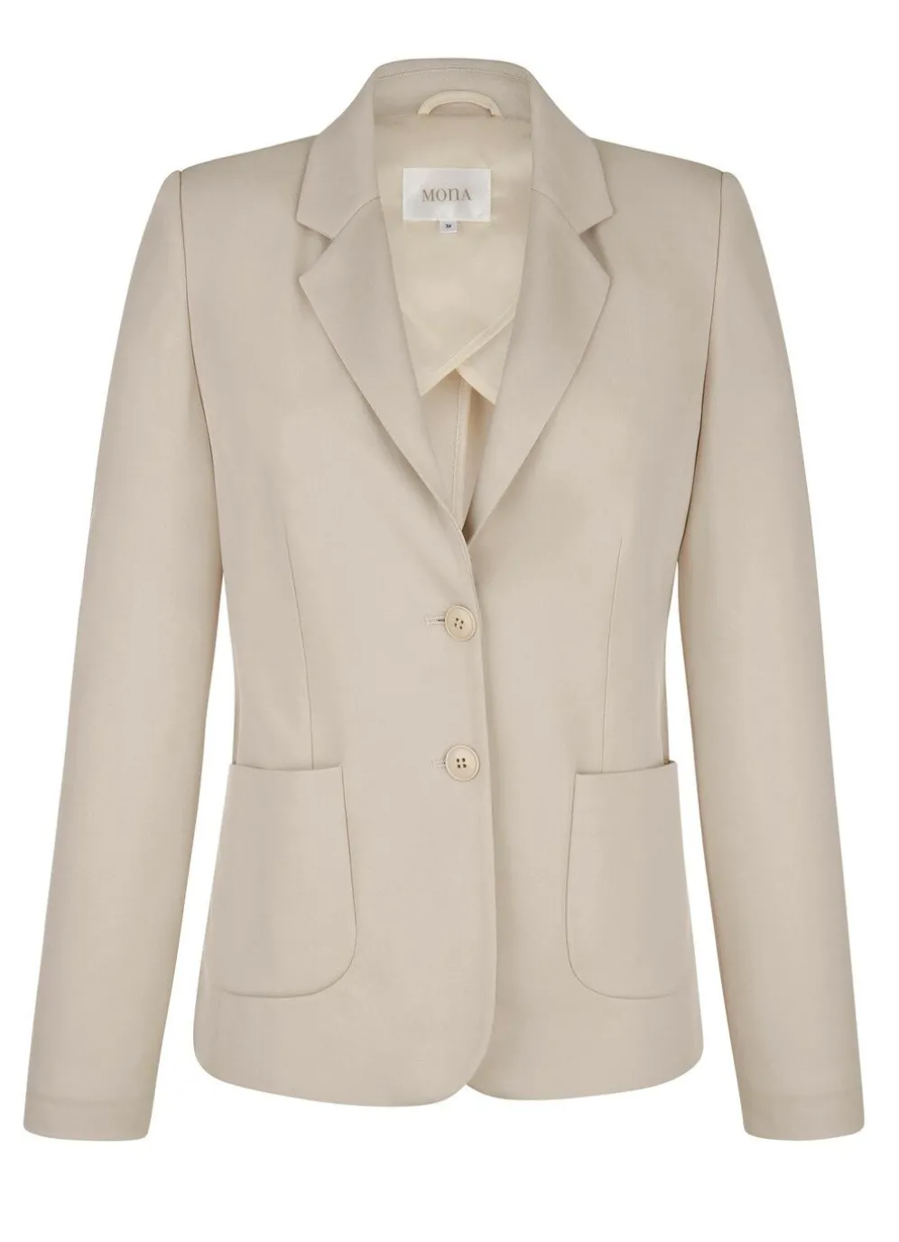 Attraktiver, leicht taillierter Blazer mit Reverskragen, Knopfleiste sowie aufgesetzten Taschen. Länge ca. 64 cm. Hergestellt aus pflegeleichtem Material und Viskose.