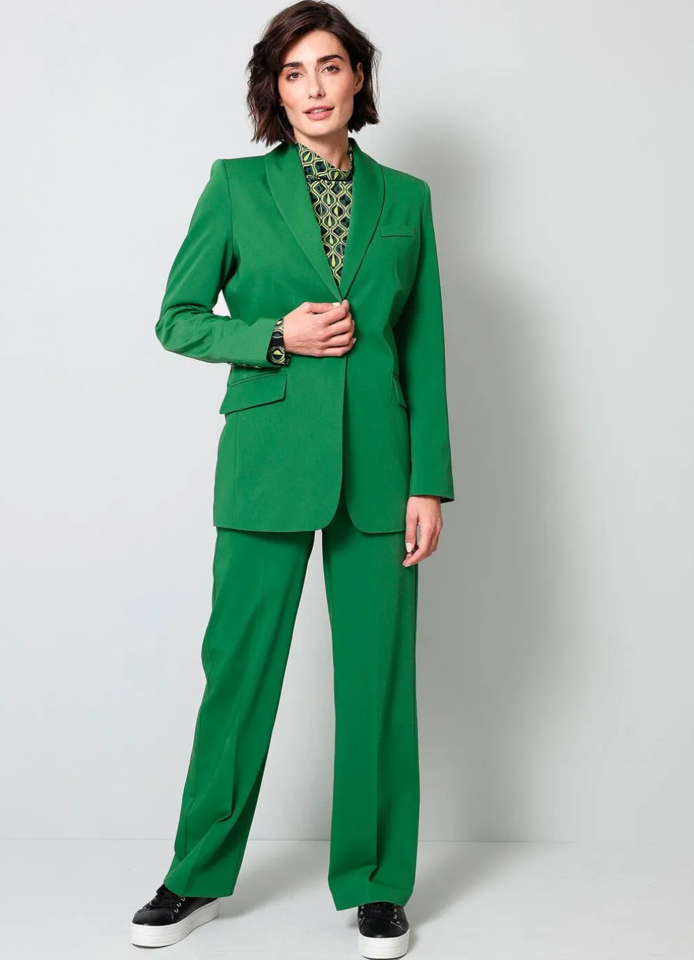 Blazer mit Schalkragen, leicht tailliert, 1-Knopf-Verschluss, Pattentaschen sowie Zierknöpfe an den Ärmelabschlüssen. Länge ca. 74 cm.