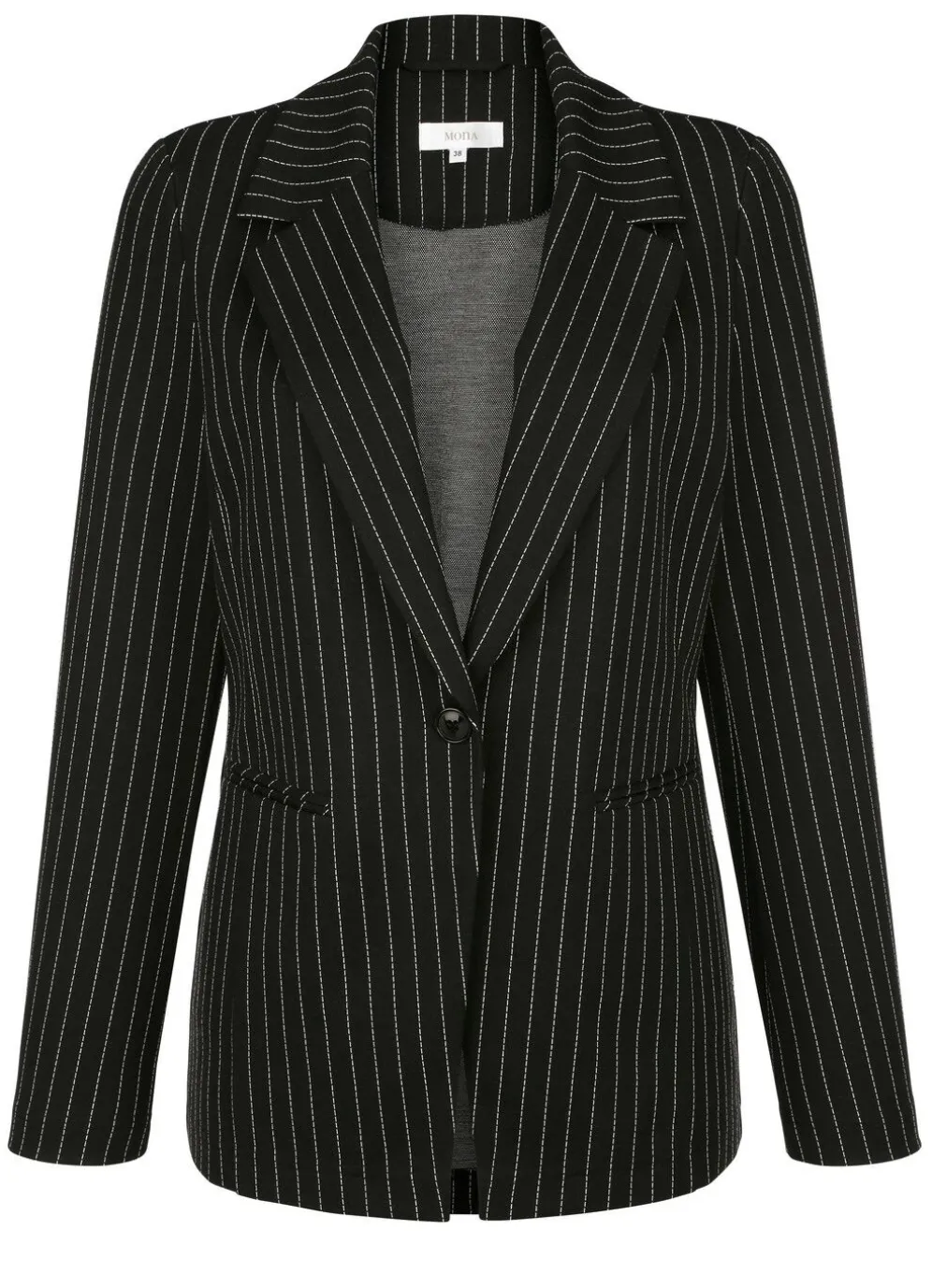 Schwarzer Jerseyblazer mit schönem Streifendessin in Weiß, Reverskragen, Knopfverschluss und Paspeltaschen. Länge ca. 65 cm.