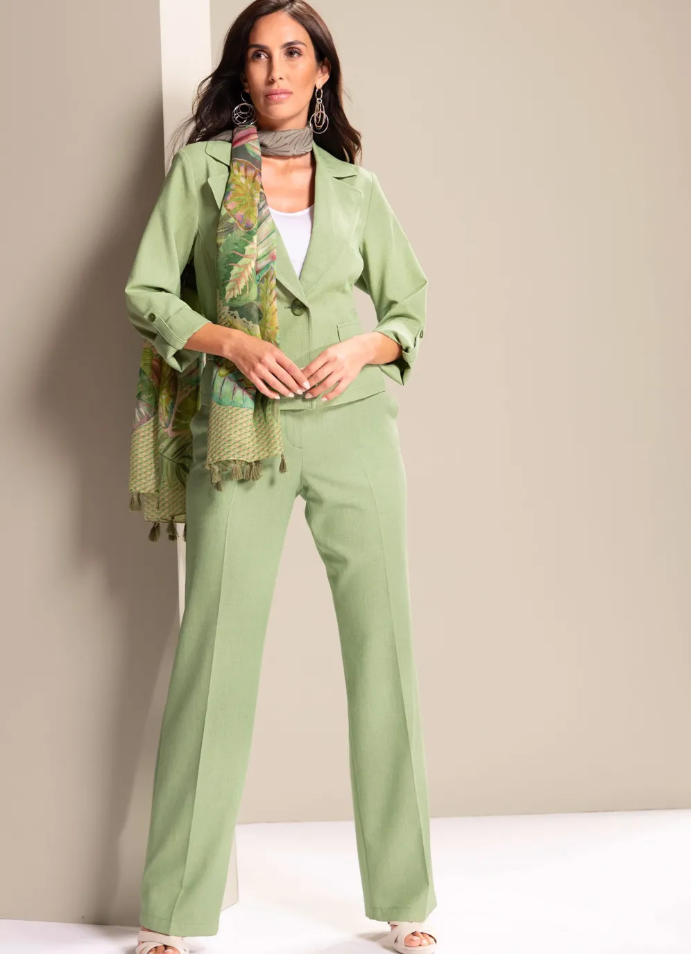 Lindgrüner Blazer von B/ANCA mit Reverskragen, Ein-Knopf-Verschluss, zwei Zierpatten sowie durch Riegel und Knopf krempelbaren Ärmelabschlüssen.