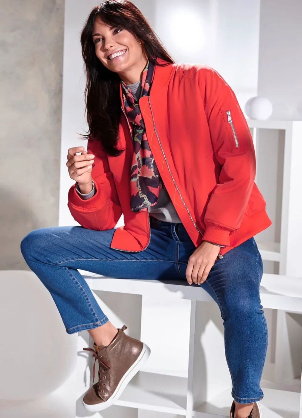 Dieser signalrote Blouson greift gekonnt den aktuellen Lässig-Style auf! Mit Rippenstrickbündchen am runden Halsausschnitt, an den Ärmelabschlüssen und am Saum, Blende und verdecktem Drucker an den Schubtaschen, 2-Wege-Reißverschluss, Reißverschlusstasche auf dem linken Ärmel sowie einer Innentasche. Länge ca. 62 cm, ab Gr. 40 ca. 66 cm, ab Gr. 46 ca. 70 cm.