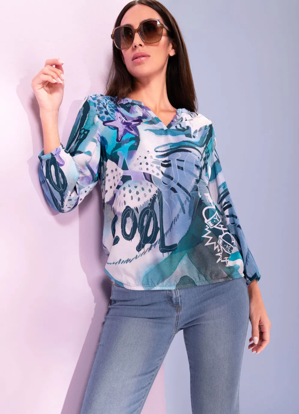Auffallend schöne Bluse von RABE in Blau-Grau-Lila-Bunt: Stehkragen am V-Ausschnitt, lange Ärmel mit elastischen Abschlüssen sowie elastischem Saumabschluss rundum.