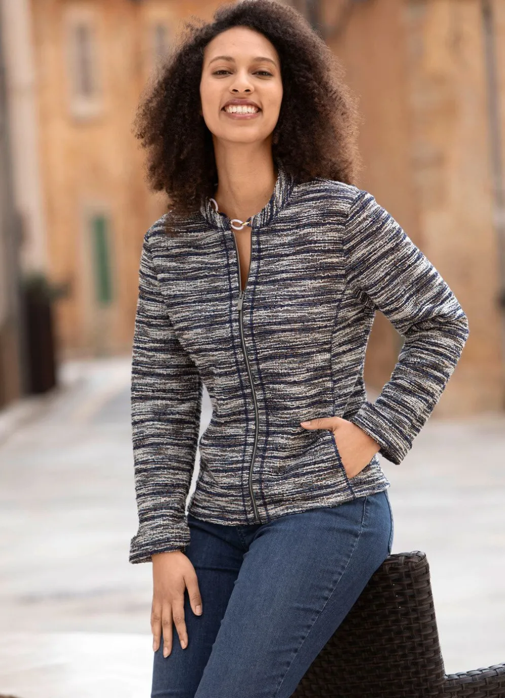 Flotte Blusenjacke in Marine-Ecru-Kupfer-Bunt, mit Stehkragen, Reißverschlussleiste, langen Ärmeln, zwei Eingriffstaschen sowie Ziersteppnähten und Wiener Nähten im Vorder- und Rückteil.