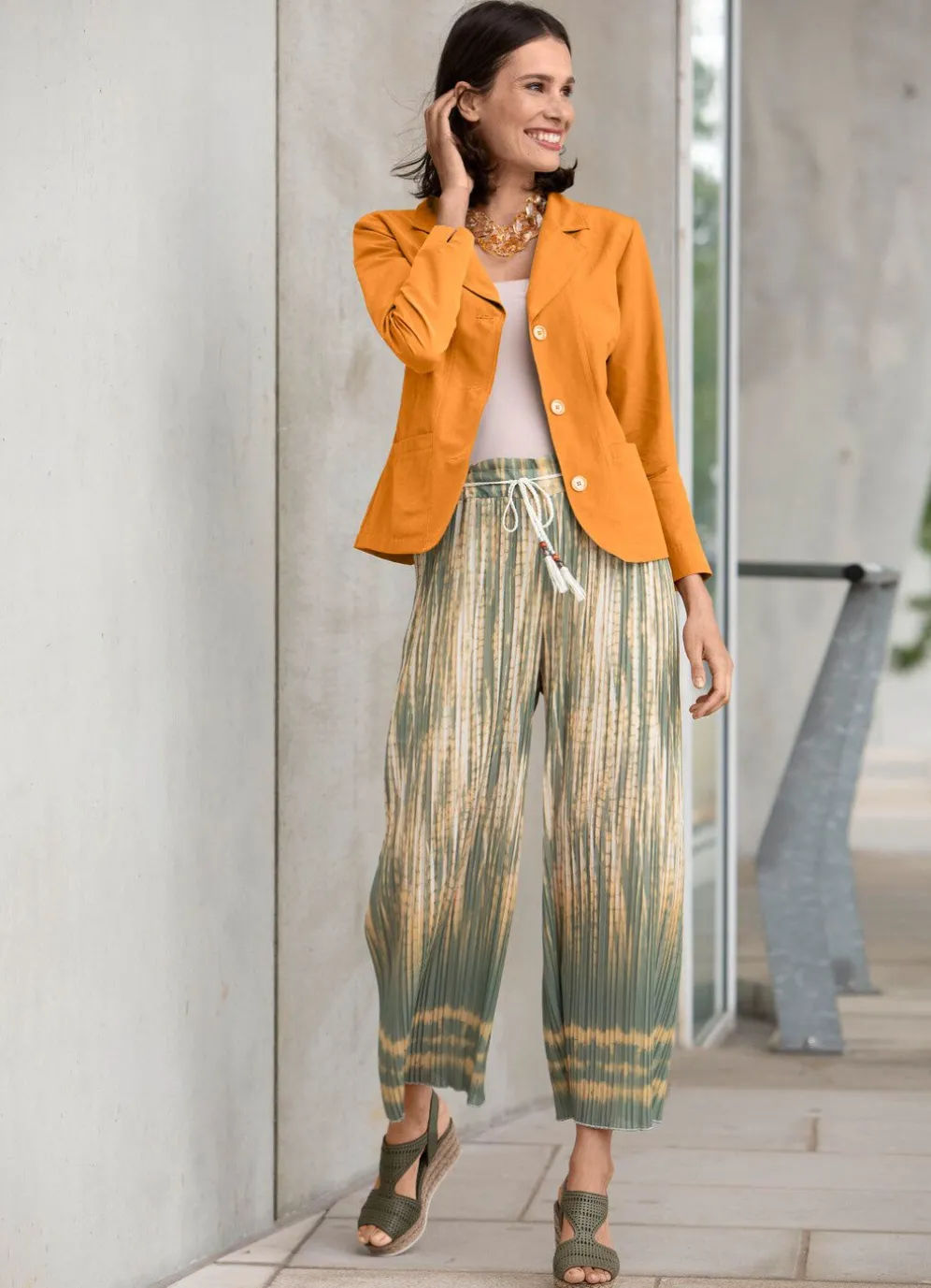 Topmodische Blusenjacke mit Schulterpolstern, Wiener Nähten im Vorder- und Rückteil, Reverskragen, Knopfleiste, langen Ärmeln sowie zwei Taschen.