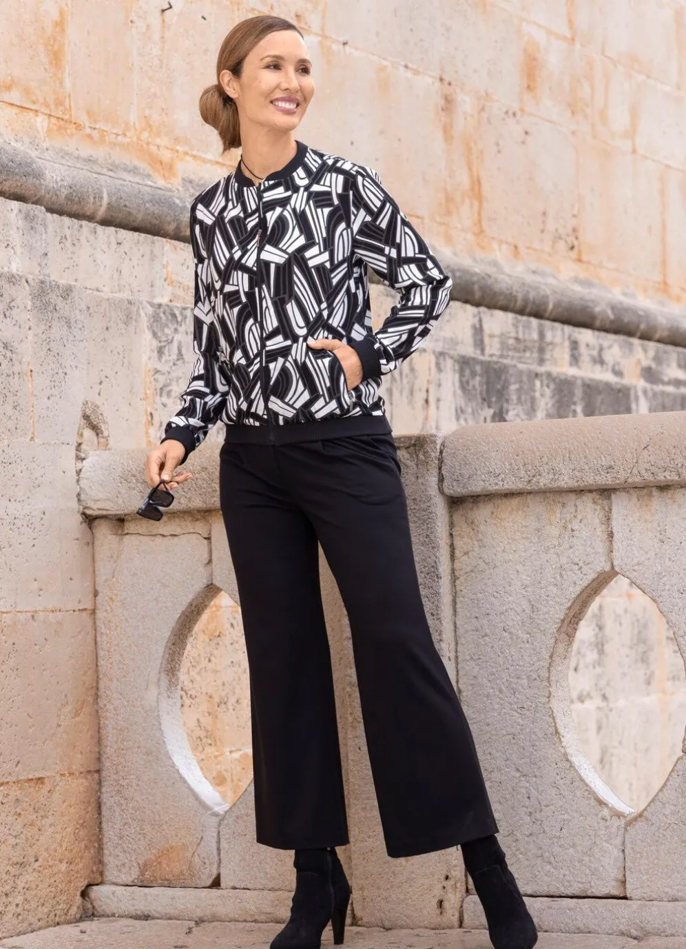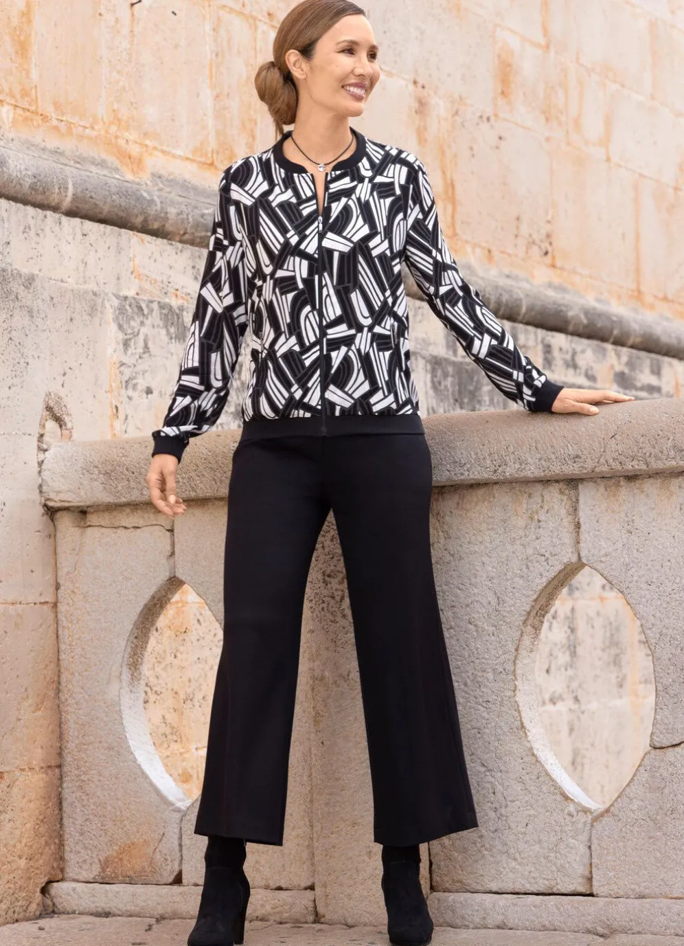 Schicke Blusenjacke mit farbbrillantem Druck in Schwarz-Weiß-Grau, schwarzem Stehkragen, Reißverschlussleiste, langen Ärmeln mit schwarzen Rippenbündchen, zwei seitlichen Reißverschlusstaschen sowie schwarzen Rippenbündchen am Saum rundum.