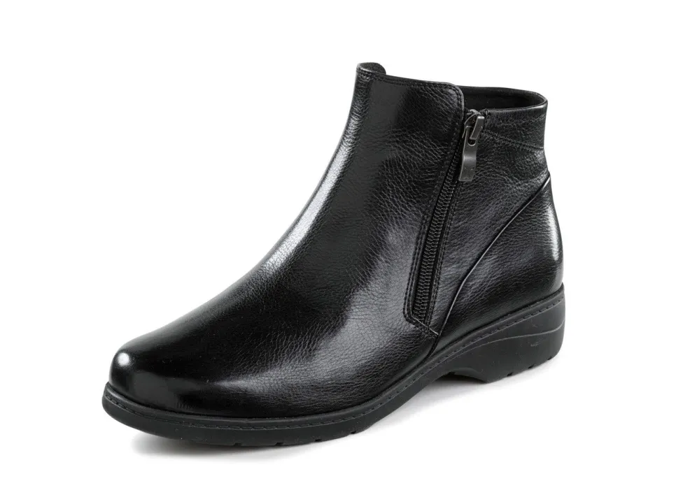 Schwarze Boots aus fein genarbtem Nappaleder: in Weite H, zwei seitliche Reißverschlüsse, Textilfutter, herausnehmbares Fußbett, leichte TPR-Profilsohle sowie 20 mm Keilabsatz. Schafthöhe ca. 10 cm