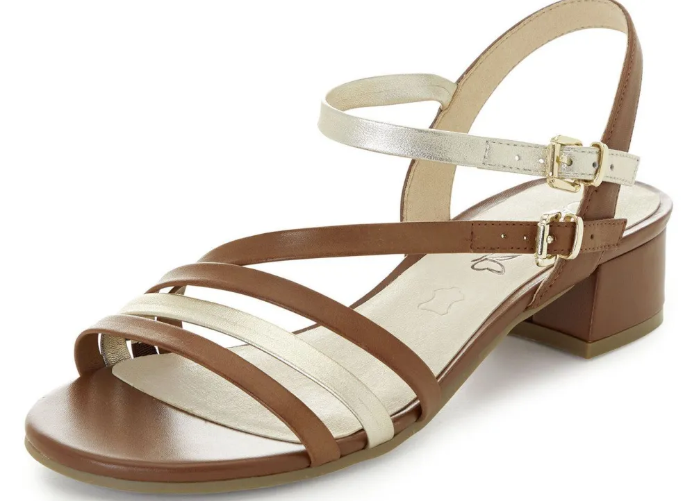 Sandalette aus teilweise metallisiertem Nappaleder: Weite G, zwei verstellbare Schließen mit verdeckten Gummizügen, Futter, Lederdecksohle, TPR-Riffelsohle sowie bezogener 30 mm Absatz