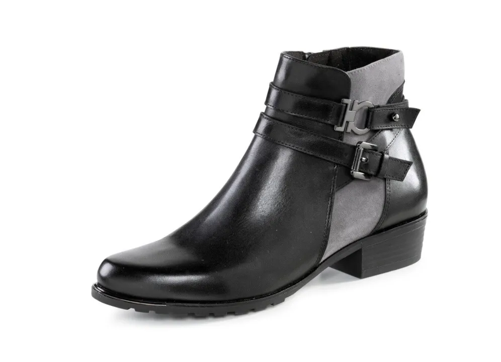 Stiefeletten aus schattiertem Nappa- und weichem Veloursleder, mit Zierspange und Innenreißverschluss: Weite G, Textilfutter, herausnehmbare Decksohle, leichte TPR-Profilsohle sowie 25 mm Absatz. Schafthöhe ca. 12 cm