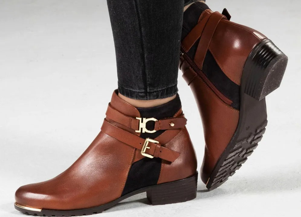 Stiefeletten aus schattiertem Nappa- und weichem Veloursleder, mit Zierspange und Innenreißverschluss: Weite G, Textilfutter, herausnehmbare Decksohle, leichte TPR-Profilsohle sowie 25 mm Absatz. Schafthöhe ca. 12 cm