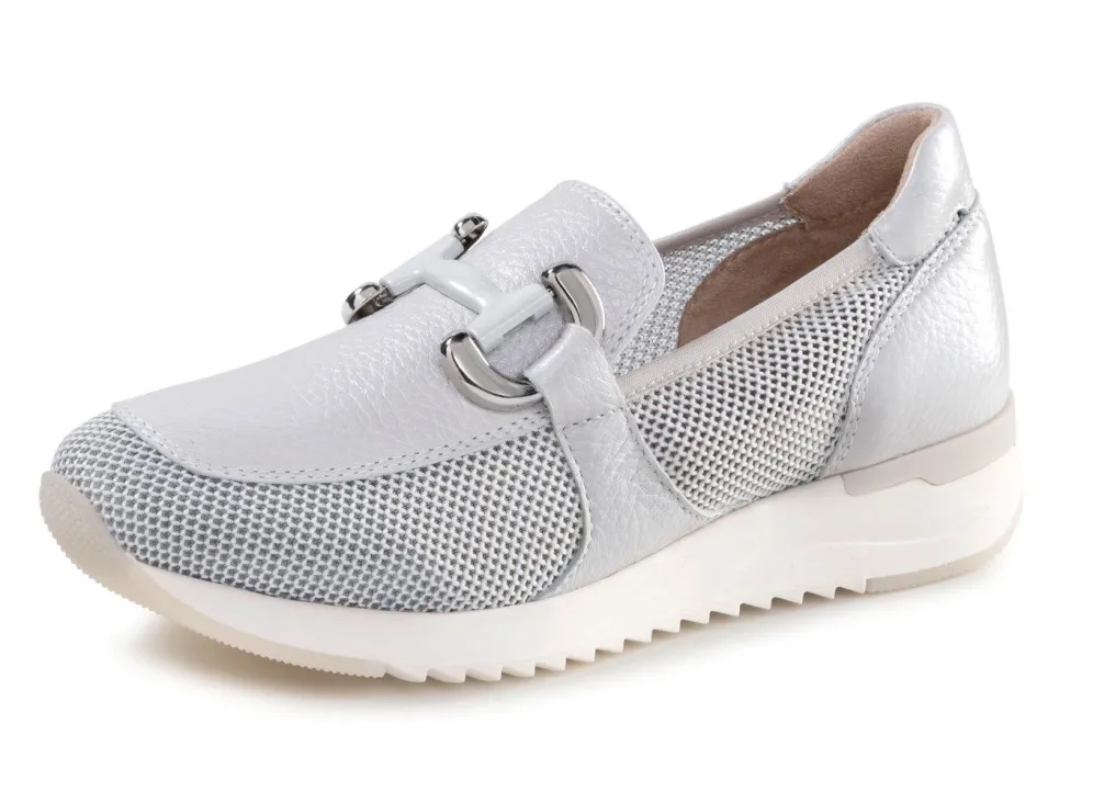 Sommerlicher Slipper aus luftigem Textilmaterial und weichem Nappaleder: Weite G, Elastik-Abschluss, Zierspange, teilweise mit Textilfutter, herausnehmbares Lederfußbett, leichte TR-Profilsohle sowie 20 mm Keilabsatz